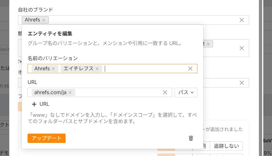 ブランド名をクリックすると、名前のバリエーションや URL も細かく設定できます。