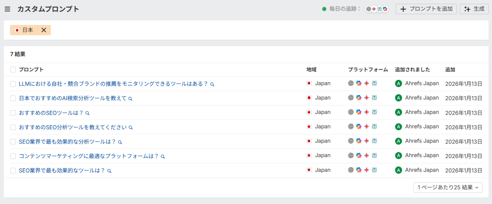 そこで Ahrefs は、皆さまの新しいブランド戦略を支援するために、ブランドレーダーへ「カスタムプロンプト機能」を追加しました。AI が自社ブランドをどう理解し、競合とどう比較しているのか。それを横断的、かつ継続的にモニタリングできるこの機能は、これからの時代の強力な武器になるはずです。