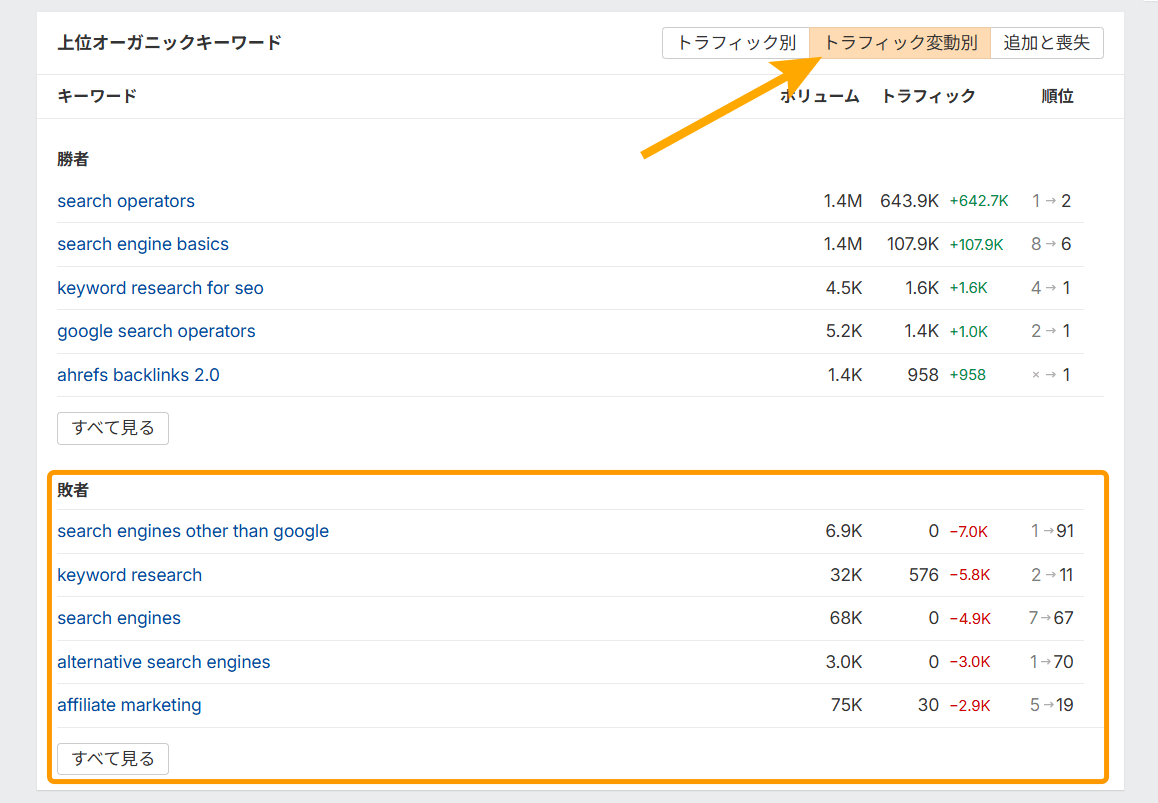ページの下部までスクロールして「上位オーガニックキーワード」レポートまで進み、「トラフィック変動別」を選択し、トラフィックが減少したキーワード一覧(=「敗者」レポート)の下部「すべて見る」をクリックします。