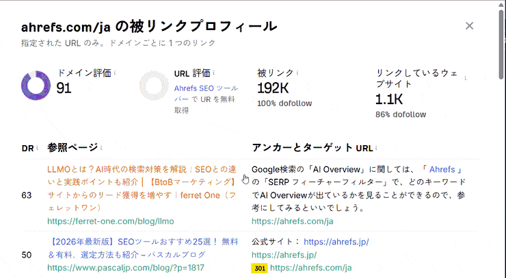 上位 100 件をサクッと確認(無料ツール):Ahrefs 無料ツールの被リンクチェッカーでは、被リンクと参照ドメインの合計数と、上位 100 件の被リンクが表示されます。