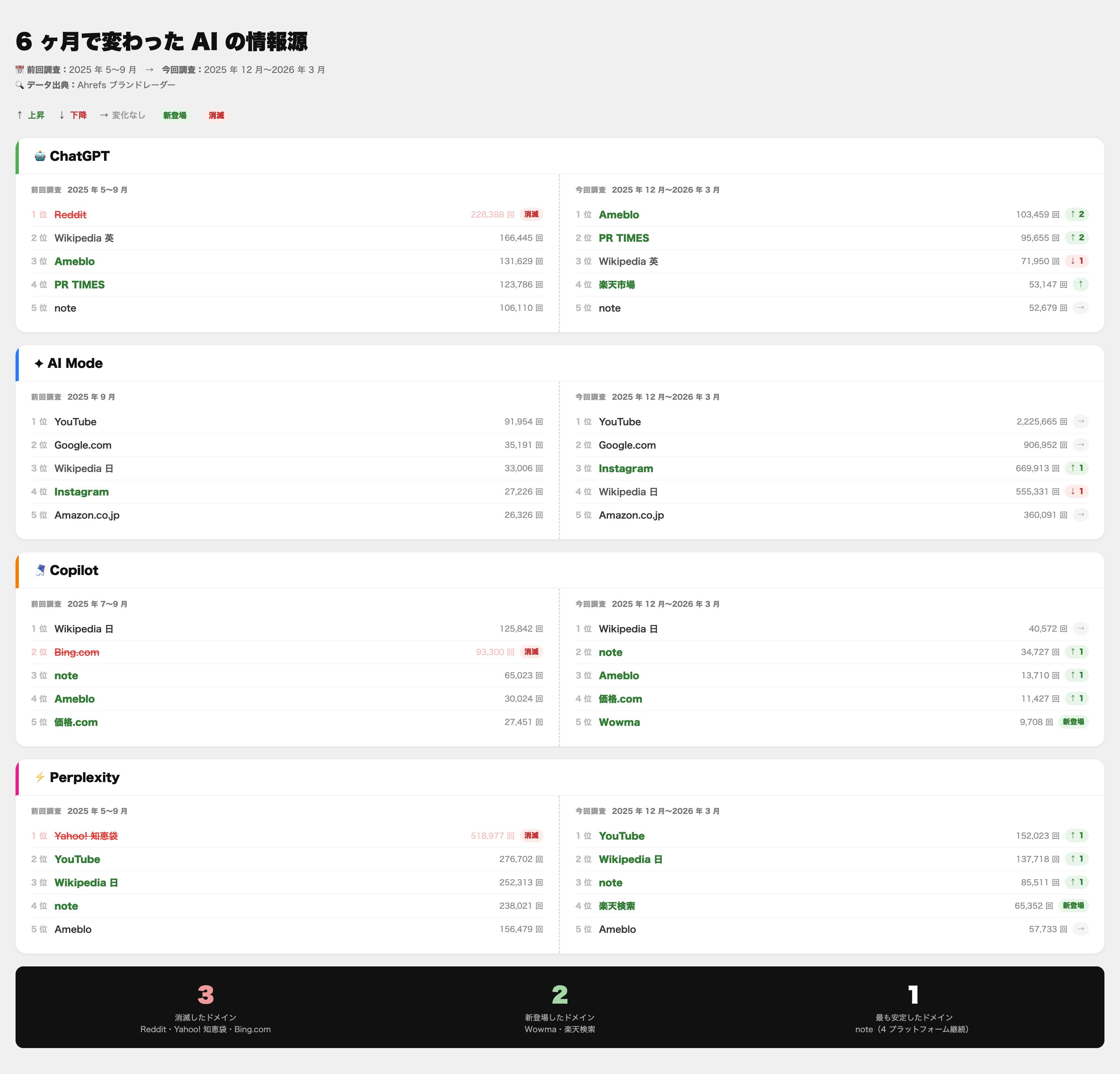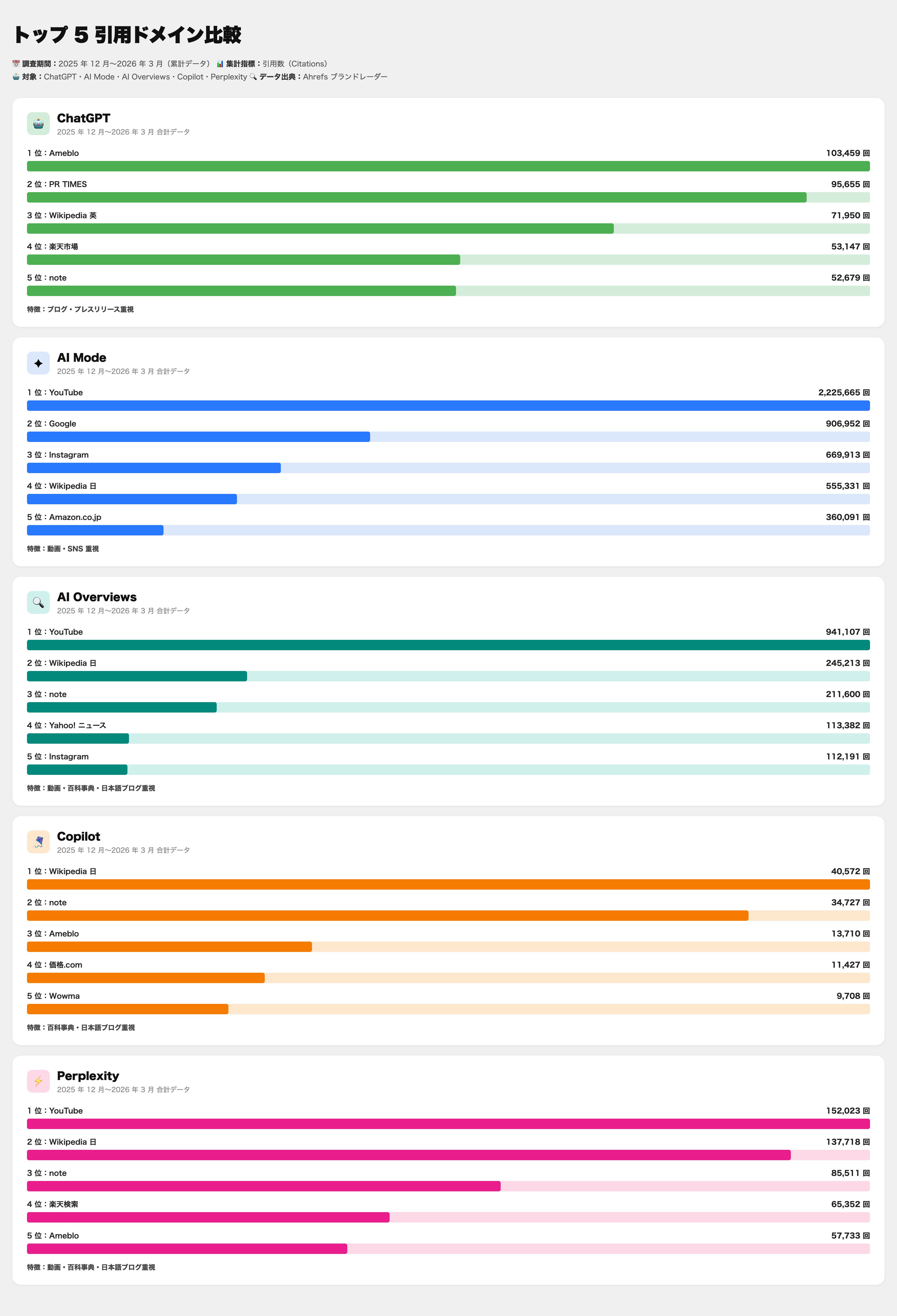 今回はその後 6 ヶ月のデータ(2025 年 12 月〜2026 年 3 月)と比較し、AI の引用傾向がどう変化したかを検証します。