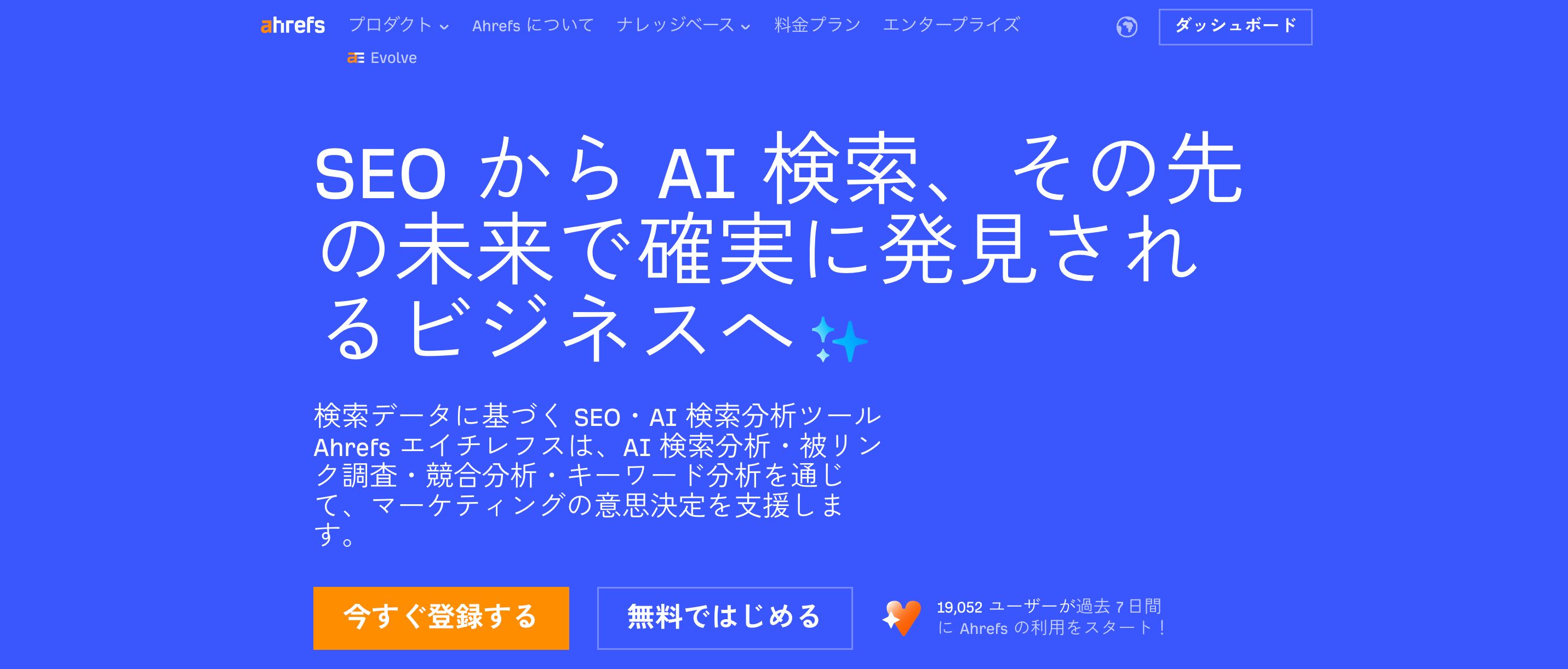 60万人が使用している世界最大級のSEOツールです。被リンクだけでなく、取得キーワードとその順位やSNSでのシェア数などについても調査可能です。優れたユーザーインターフェースも魅力です。