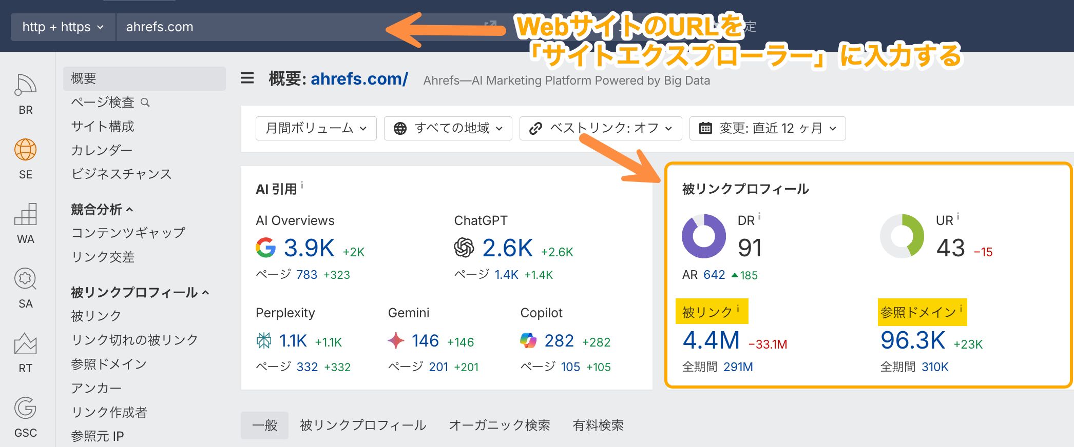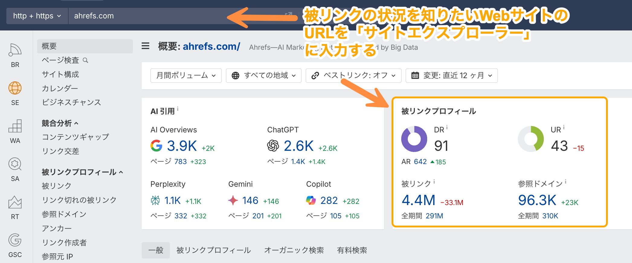 被リンクの量についても簡単に確認できます。サイトエクスプローラーの概要レポートを見てみましょう。