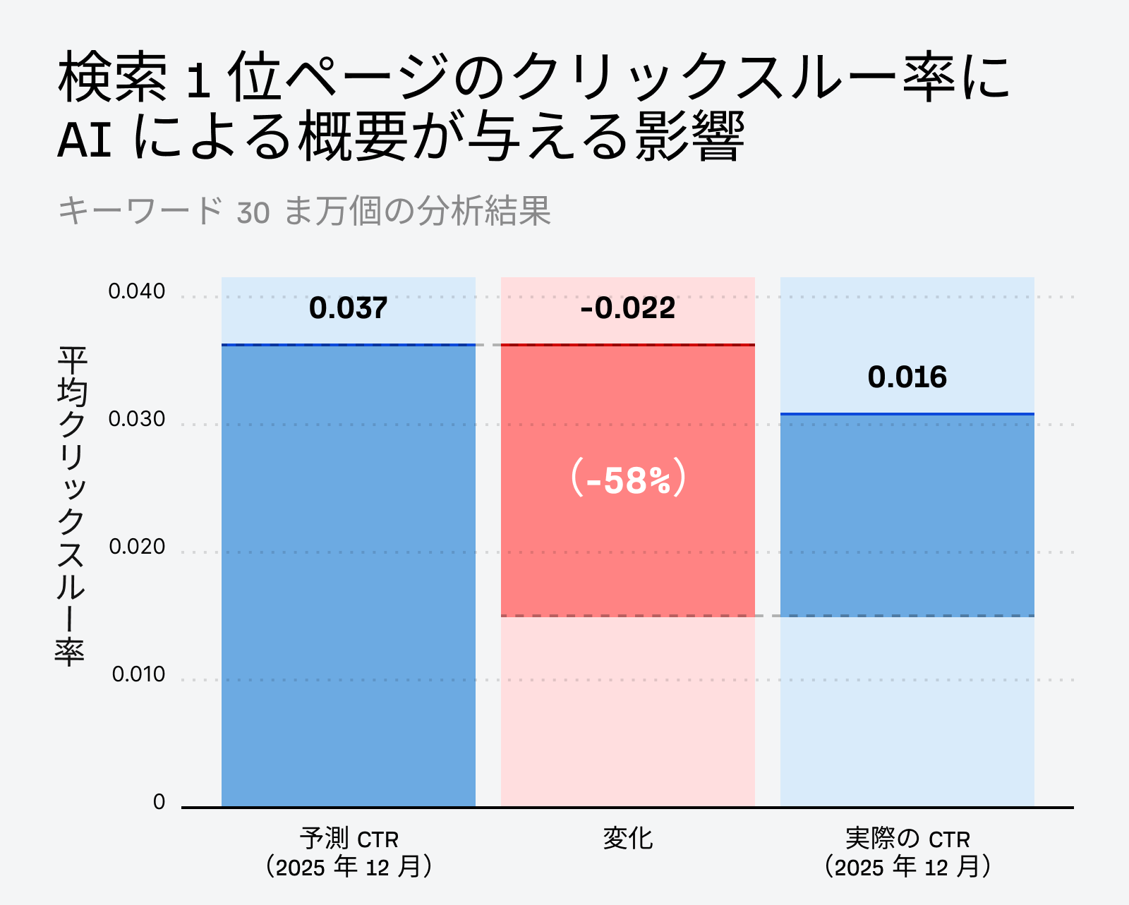 一方、Ahrefs の調査では、AI Overview がクリックを約 58% 抑制することがわかっています。
