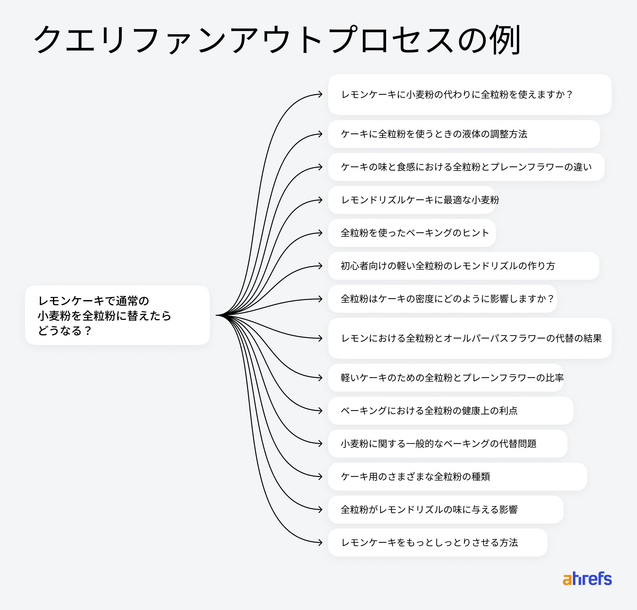例えば「レモンドリズルケーキを作る際、薄力粉を全粒粉に置き換えたらどうなるのか」といいったユーザーの質問に対して、AI は「レモンドリズルケーキに最適な粉」「全粒粉がケーキの触感や密度に与える影響」「全粒粉でお菓子を焼く際のコツ」といった複数のファンアウトクエリを生成する可能性があります。