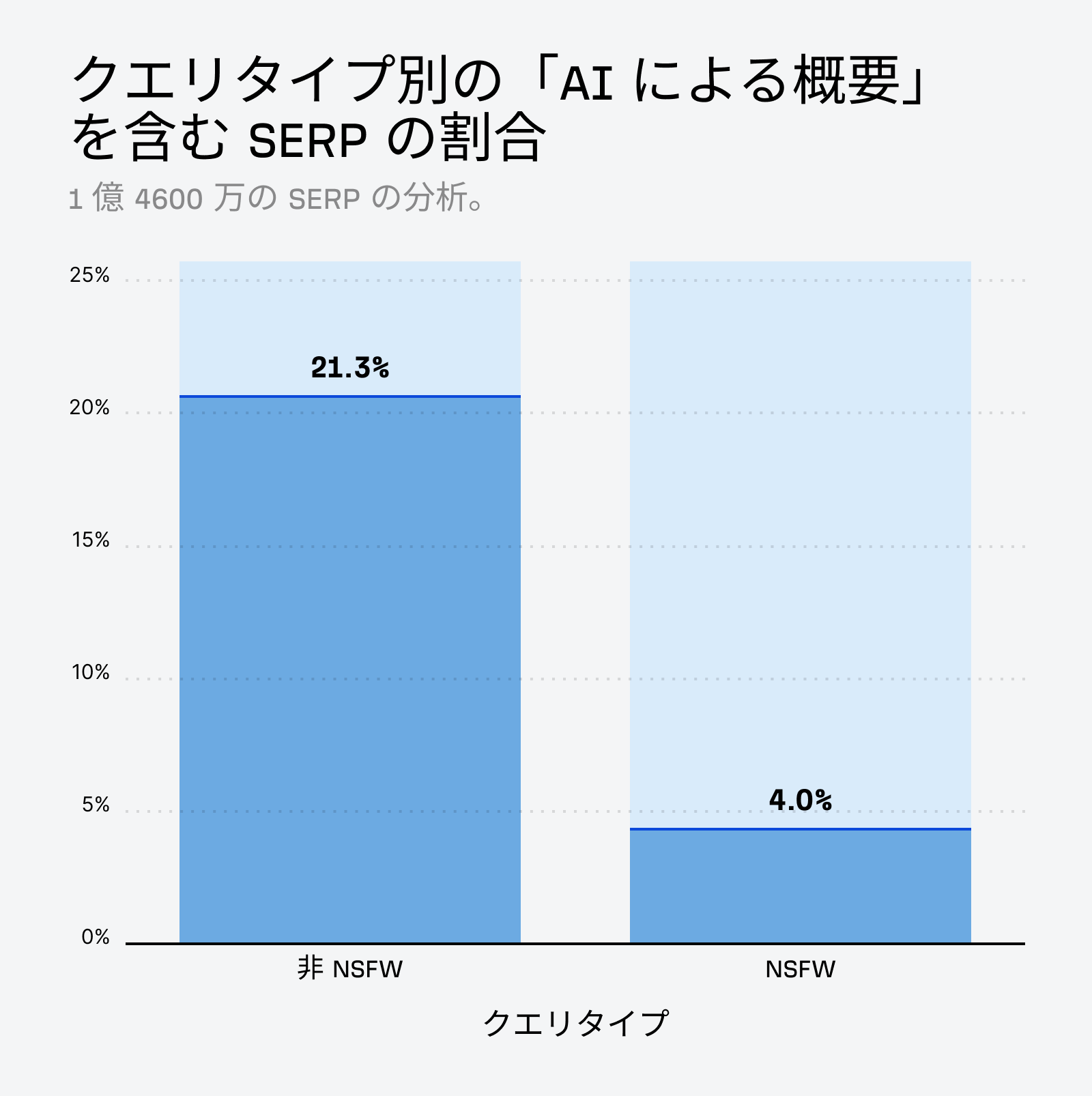 1 億 4,600 万件の SERP を分析したところ、AI による概要は全キーワードの 21% で表示されていることが分かりました。ただし、クエリの種類によって表示されやすさには大きな差があります。