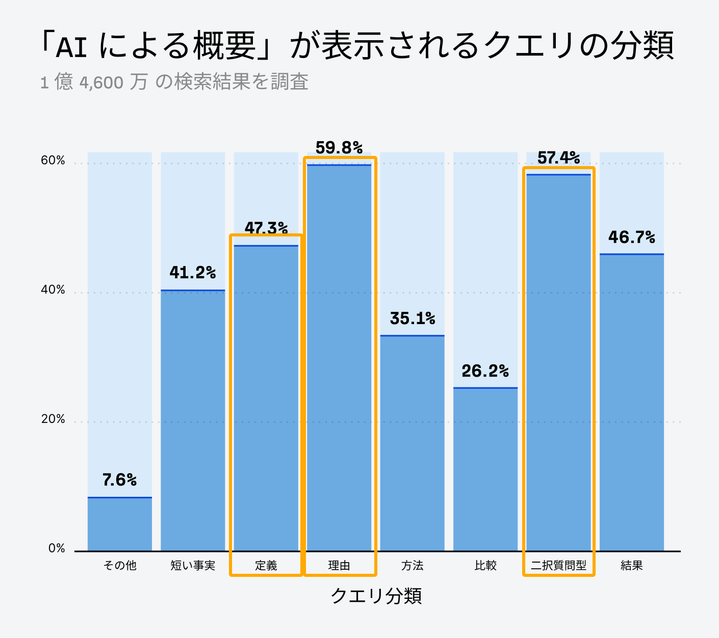 質問の種類も結果に影響します。なかでも「なぜ」を問う理由系のクエリは、59.8% という最も高い割合で AI による概要が表示されました。