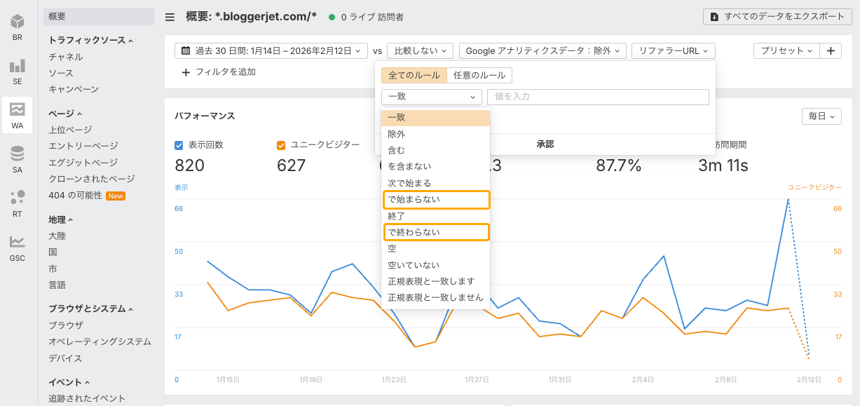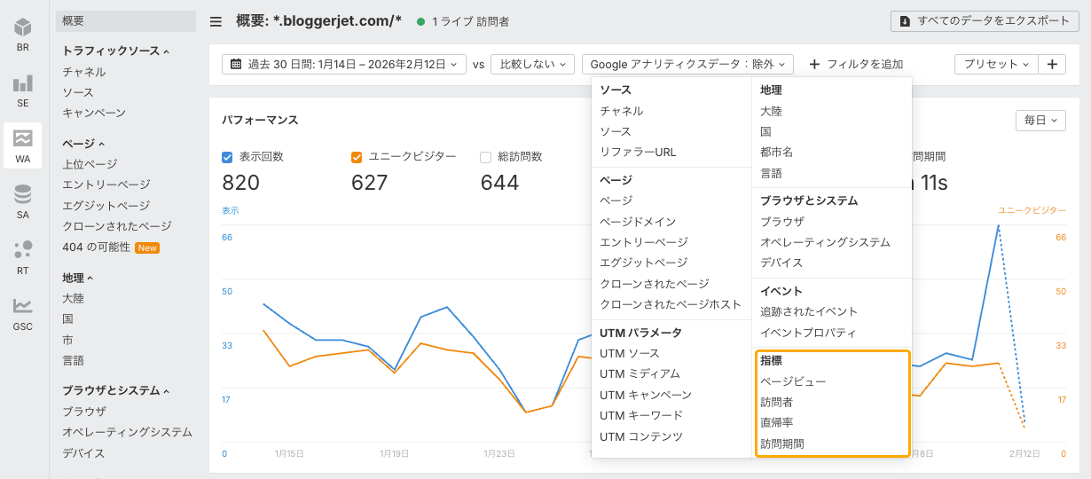 ページビュー、訪問者数、直帰率、訪問滞在時間などの指標でウェブ分析レポートをフィルタリングできるようになりました。指標フィルタは、テーブルにその指標が表示されていない場合でもレポート全体に適用されるため、価値の高いトラフィックやパフォーマンスの低いセグメントを簡単に特定できます。