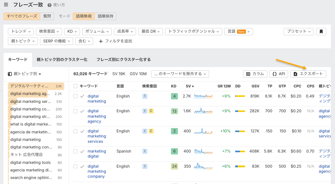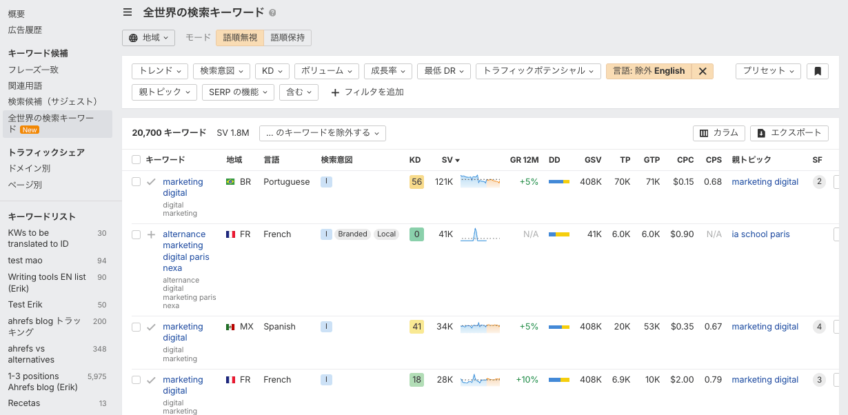 単一の国や言語に限定されることなく、グローバルにキーワードを調査できるようになりました。グローバルキーワードは、世界規模の需要を明らかにし、ローカルのデータセットでは見落とされがちな多言語の機会を見つけるのに役立ちます。