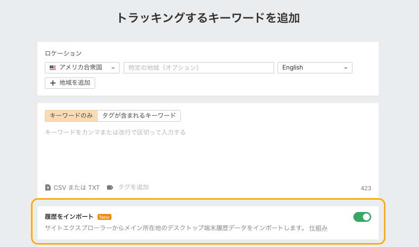 プロジェクトにキーワードを追加する際、またはレポート内の一括操作により、サイトエクスプローラーからキーワードの履歴データをランクトラッカーにインポートが可能になりました。これにより履歴データが即座に補充されるため、トレンドを確認するために数ヶ月待つ必要がありません。