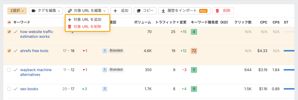 ターゲット URL の割り当てや削除を一括で行えるようになりました。これにより、大規模なキーワードセットの管理が迅速になり、複雑なプロジェクトでの手動ミスを減らすことができます。