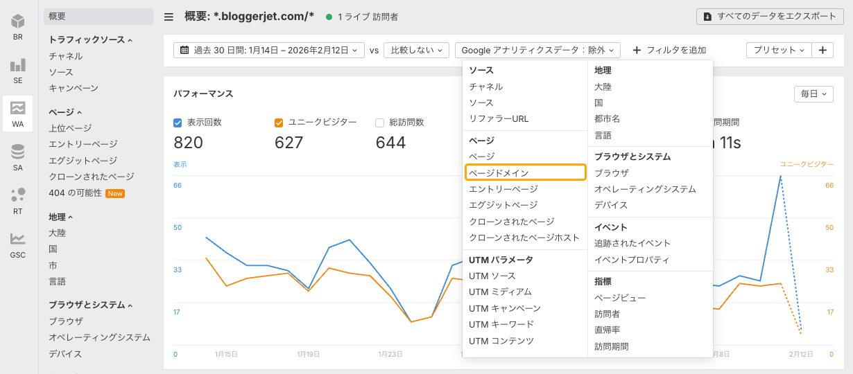 新しい「ページドメイン」フィルタでは、プロトコルや完全な URL を除いたドメインのみでフィルタリングできます。これにより、結果が空になることを防ぎ、大規模または複雑なサイトの分析をスピードアップできます。