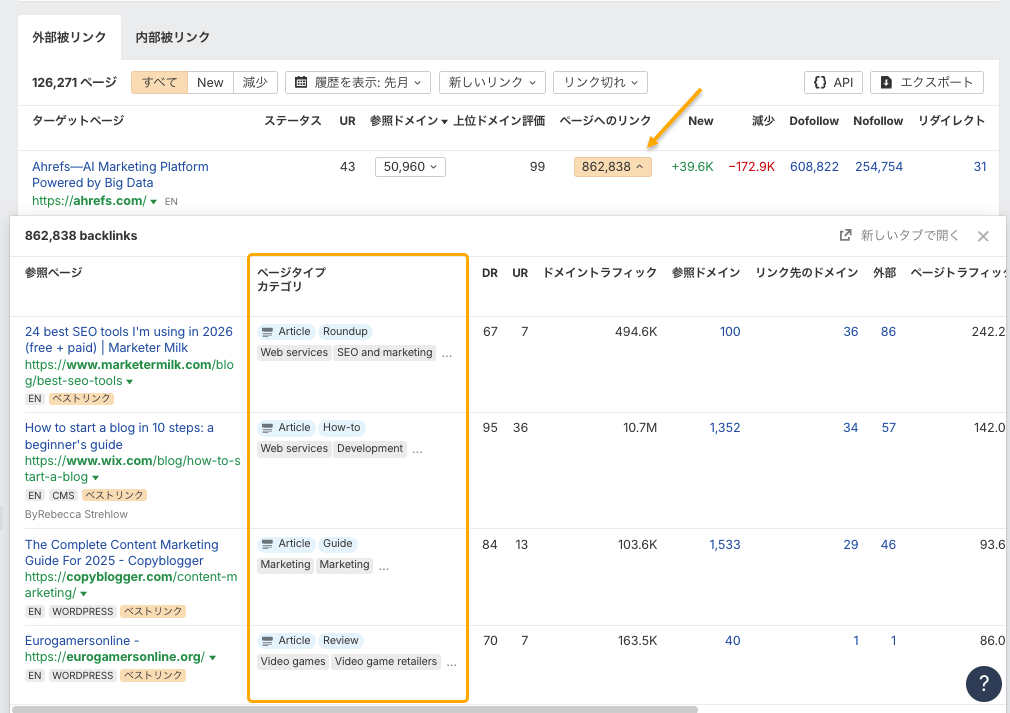 被リンクレポートに、ページタイプとページカテゴリーの列およびフィルタが追加されました。ページタイプには、参照ページが記事、おすすめサイト、口コミサイトなどのどの形式であるかを示し、カテゴリーはビジネスの業種やトピックを反映します。これにより、量だけでなく文脈に基づいてリンクの質を判断しやすくなります。