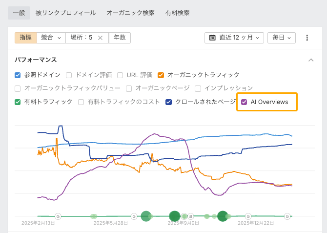 サイトエクスプローラーの「概要」の「パフォーマンス」チャートで、AI による概要の履歴が直接表示されるようになりました。これにより、他の主要なパフォーマンス指標とともに AI への露出状況を一箇所で追跡できます。