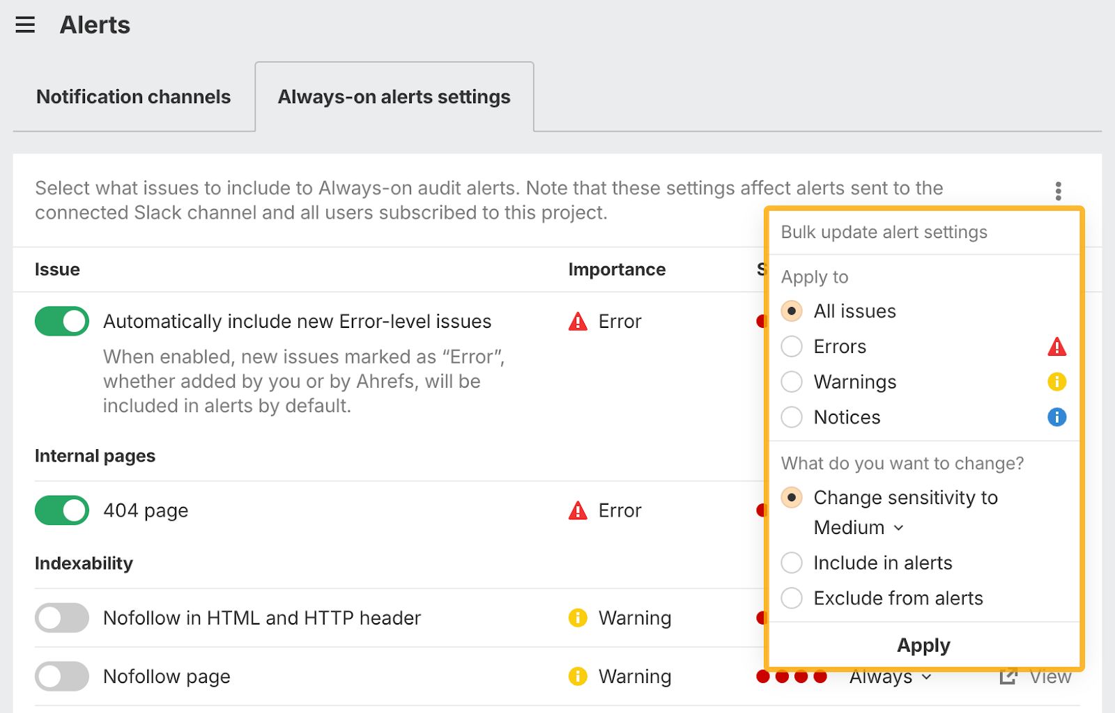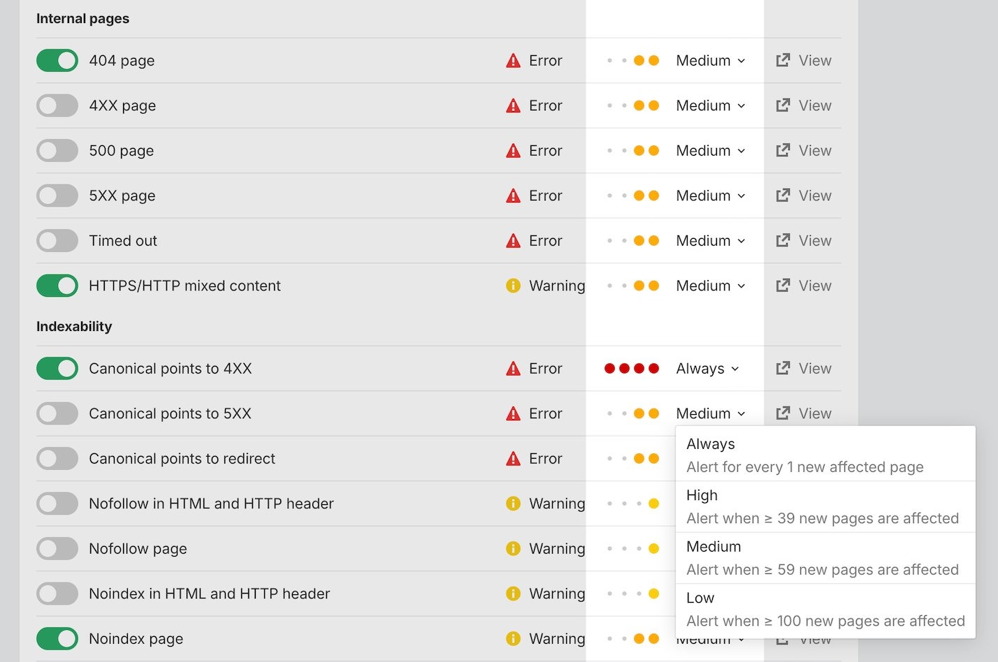 アラートの感度が問題ごとに設定可能になりました。問題の深刻度やサイトの規模に基づいてアラートを送信するタイミングを調整することができます。