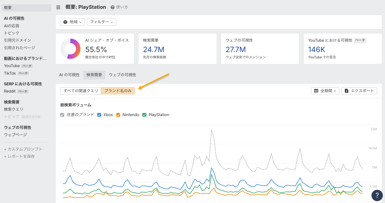 「検索需要」タブで、総検索ボリュームと検索クエリを単一のビューで確認できるようになりました。また、地域別の検索ボリュームを示す新しいチャートが追加され、関連クエリとは別で、ブランド需要を分離するための「ブランド名のみ」モードも導入されました。