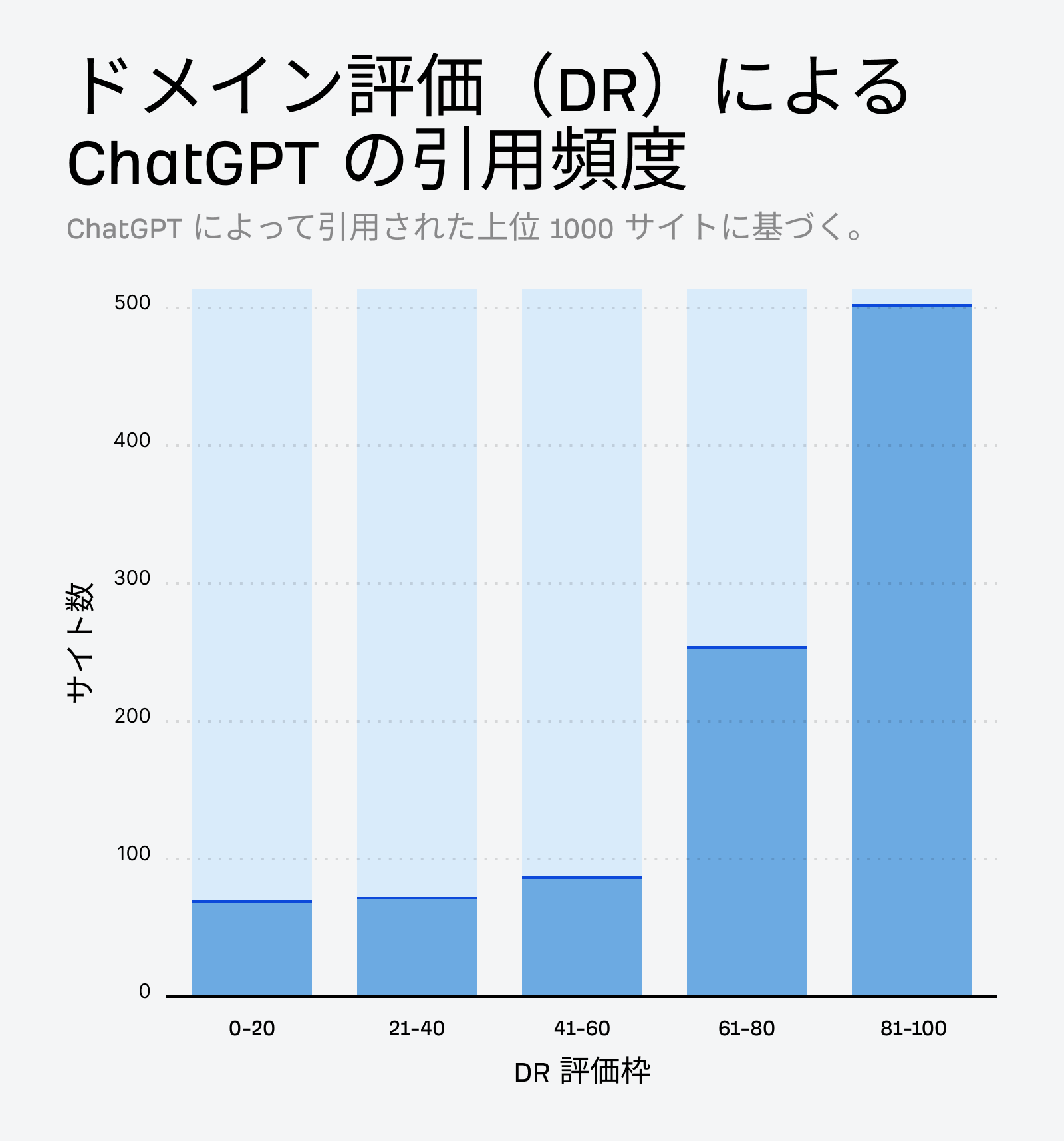 ChatGPT に最も頻繁に言及されている上位 1,000 件のサイトを分析したところ、AI はドメインレーティング (DR) 60 以上のウェブサイトを好むという明らかな傾向が見られ、ほとんどの引用が DR 80~100 の高権威ドメインからされていました。