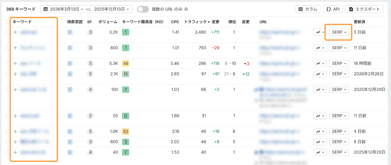 まずはサイトエクスプローラーで競合サイトを検索し、オーガニックトラフィックキーワードを分析してみましょう。SERP 画面も確認できるので、キーワードごとに検索意図の分析も行うのがベストです。