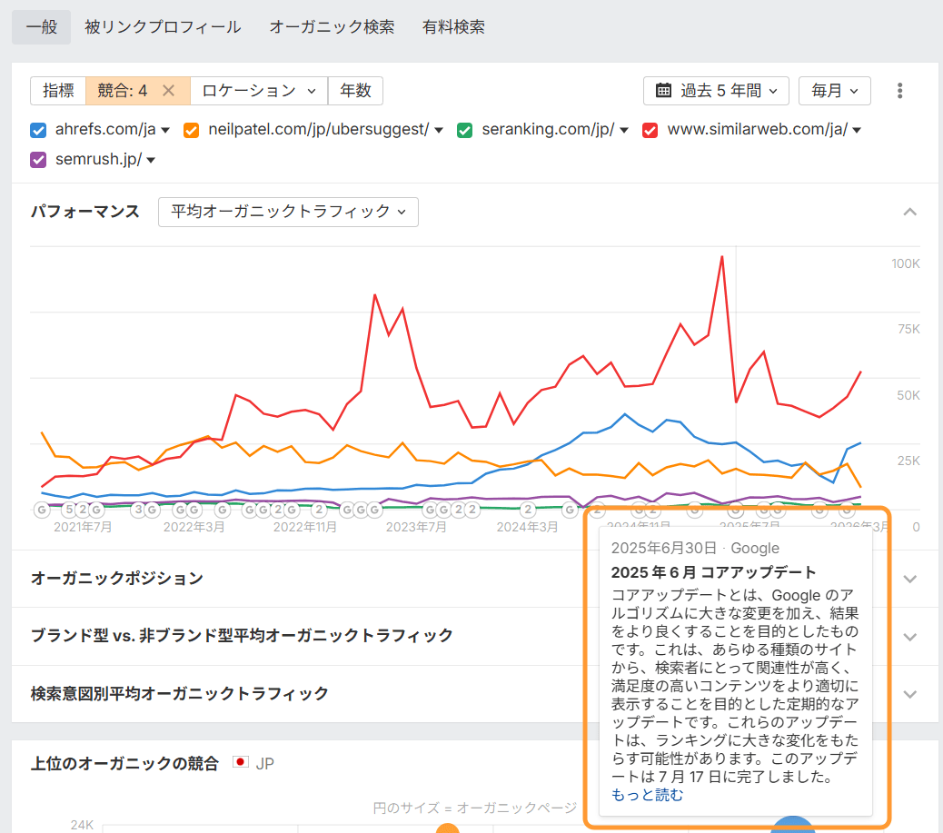 SEO の効果やアルゴリズムの影響は、継続的にモニタリングをすることで初めて見えてきます。そのため、競合分析では、自社や競合の順位変動などを継続的に追跡することが重要です。Ahrefs のサイトエクスプローラーでは、Google のコアアップデートの時期と自社の順位変動を重ねて確認できるので、「なぜ動いたのか」をアルゴリズムの背景と一緒に分析できます。この「継続的な観察」こそが、スマートで効果的な SEO 競合調査の秘訣です。
