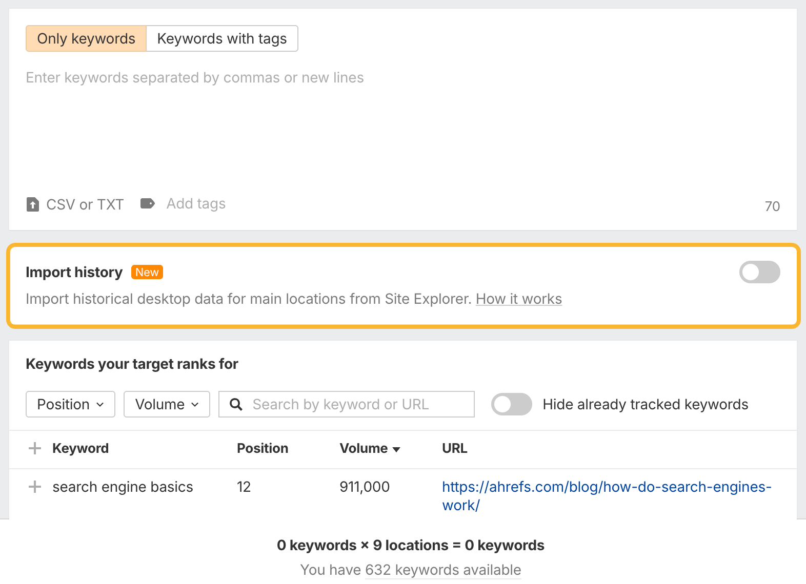 You can now import historical keyword data from Site Explorer into Rank Tracker, either when adding keywords to a project or via a bulk action in reports. This instantly backfills historical data, so you don’t need to wait months to see trends.