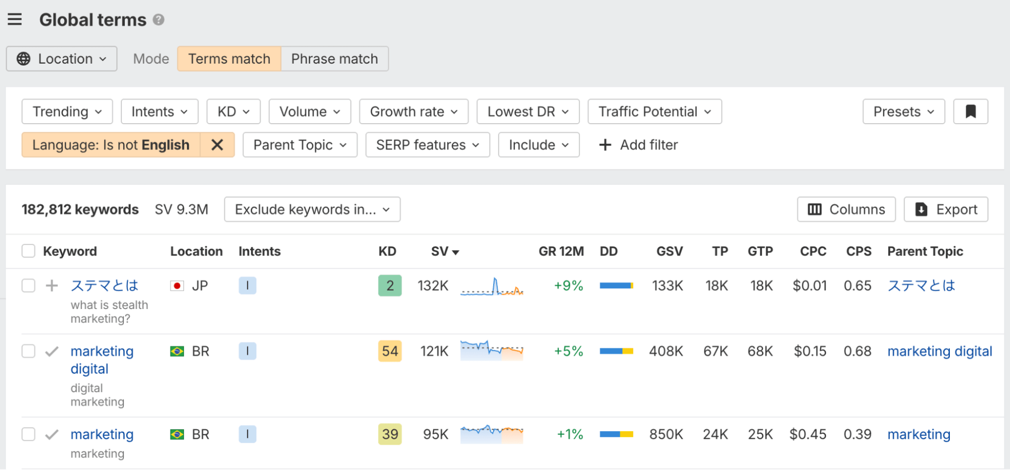 You can now research keywords globally instead of being limited to a single country or language. Global terms help uncover worldwide demand and spot multilingual opportunities that local datasets often miss.