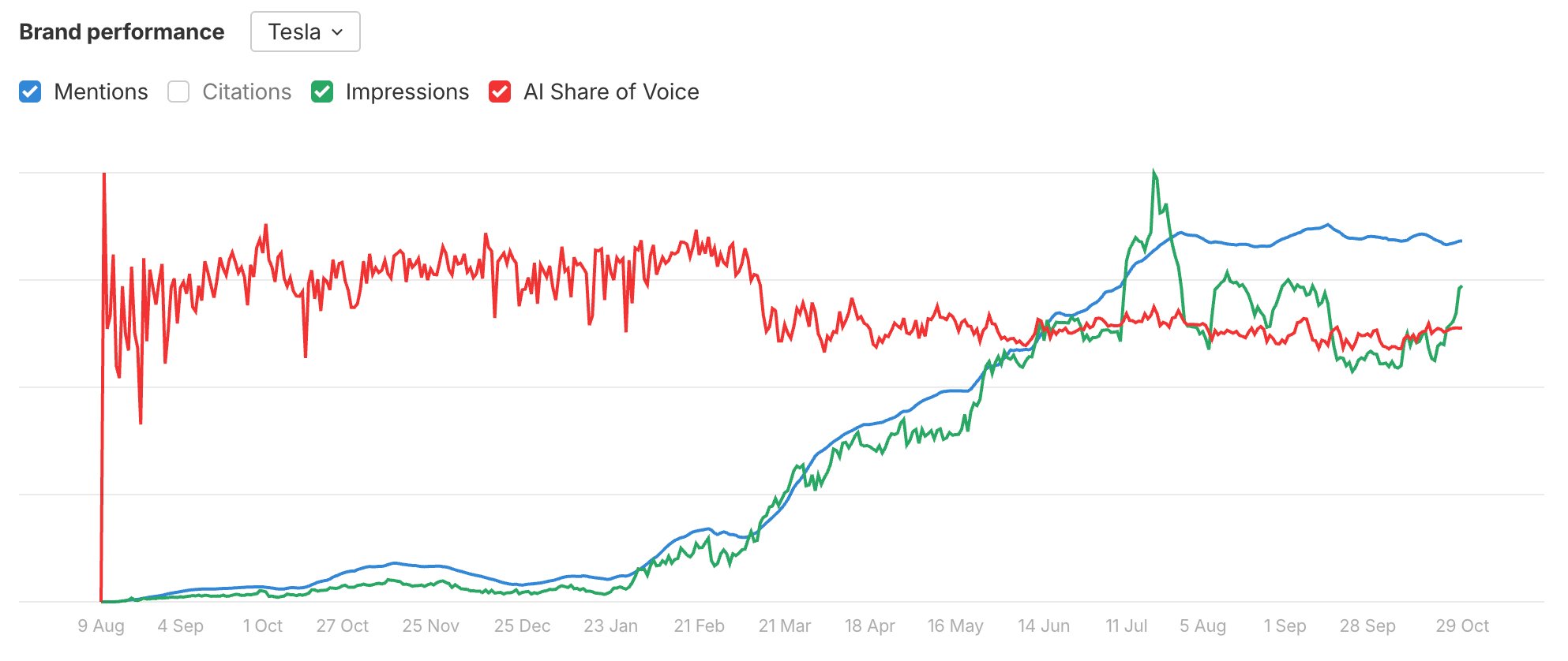 24 Oct: Brand Radar introduced a new Brand Performance chart comparing mentions, citations, impressions, and AI Share of Voice across platforms.