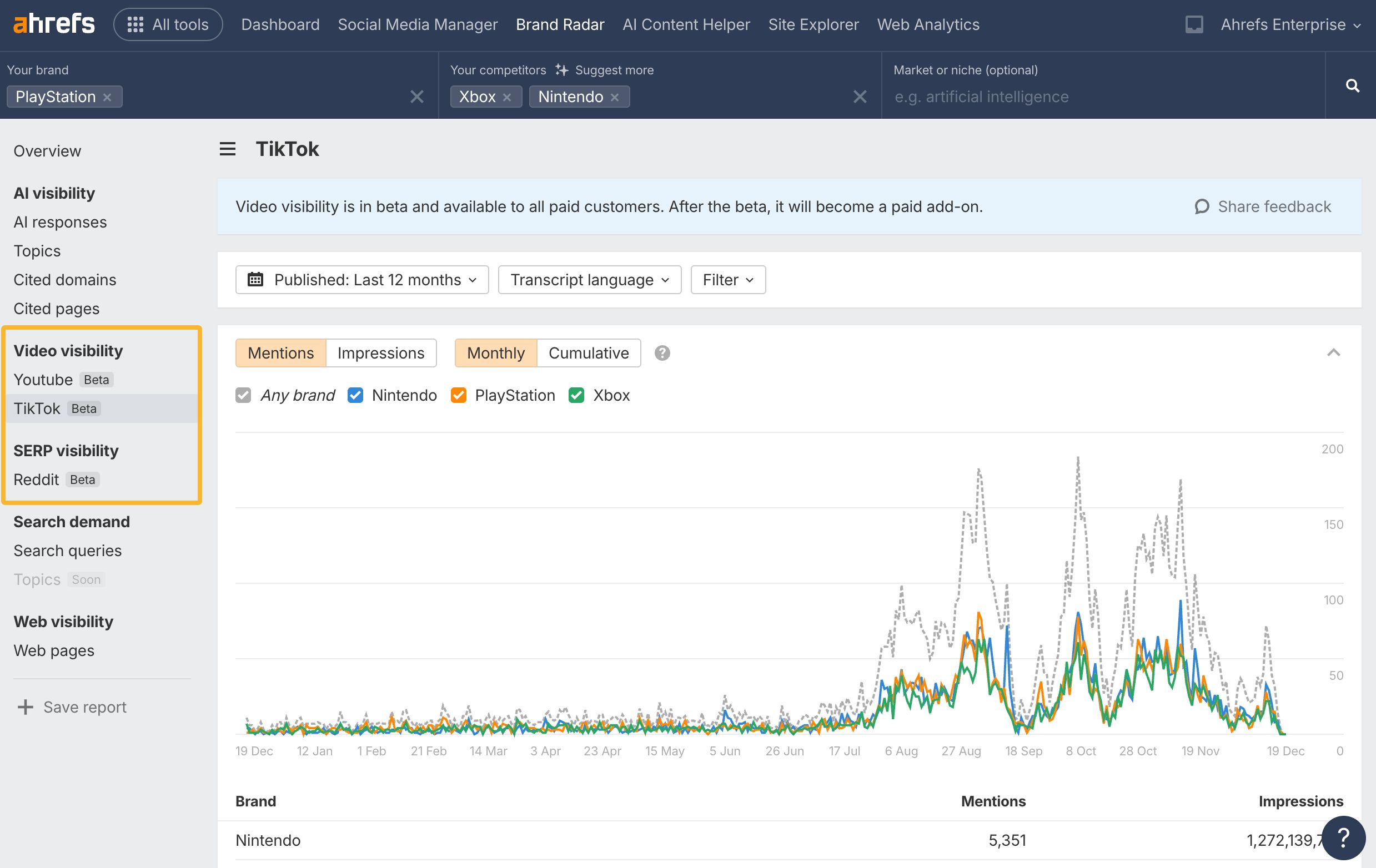 YouTube, TikTok, and Reddit indexes are available while in beta for all paid Ahrefs customers. They will move into Brand Radar add-ons after beta.