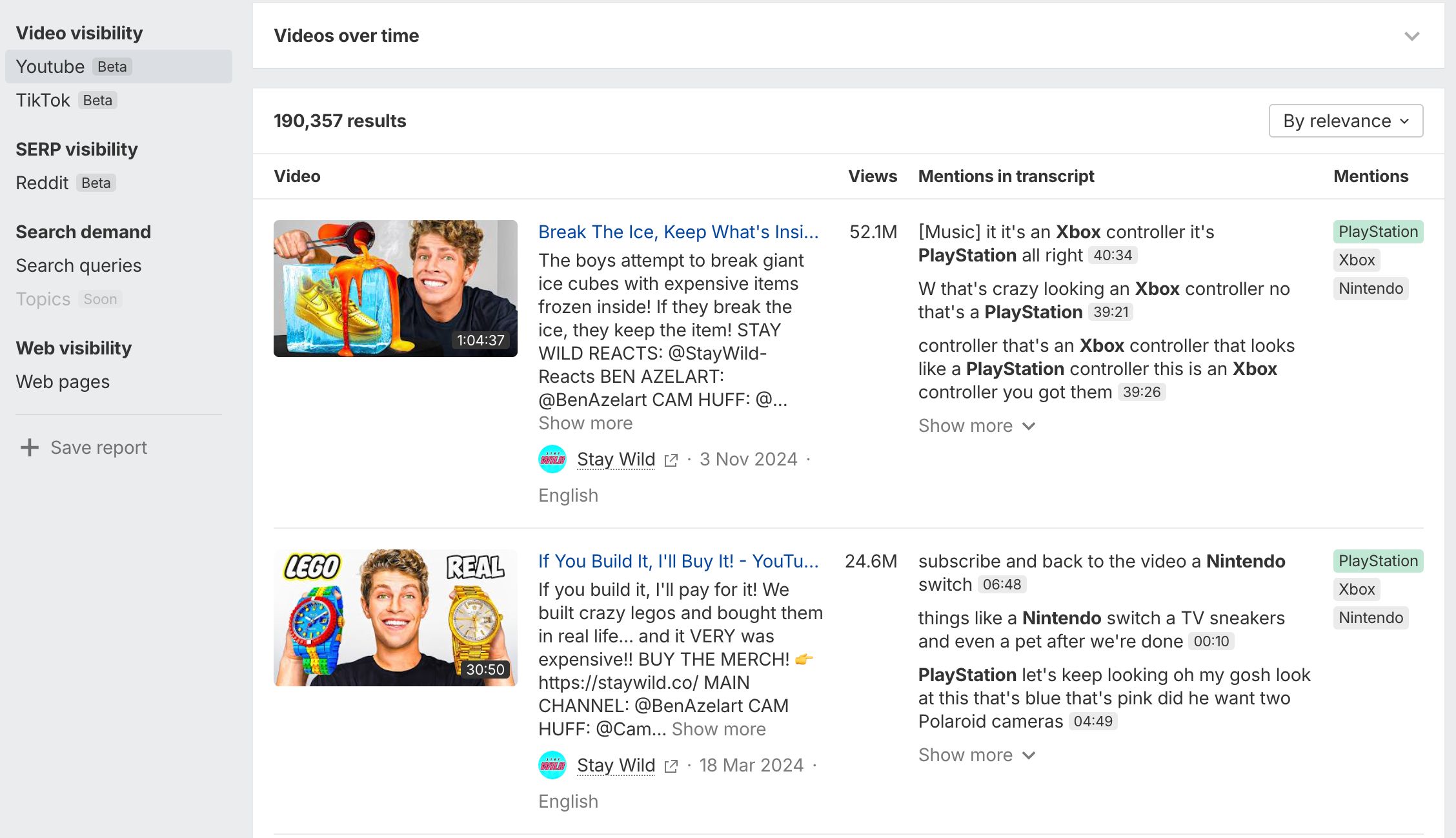 Brand Radar now scans video descriptions, transcripts, and titles for mentions, surfacing only snippets with brand mentions, instead of full transcripts. Teams can quickly see which videos reference their brand and understand the context those mentions appear in.