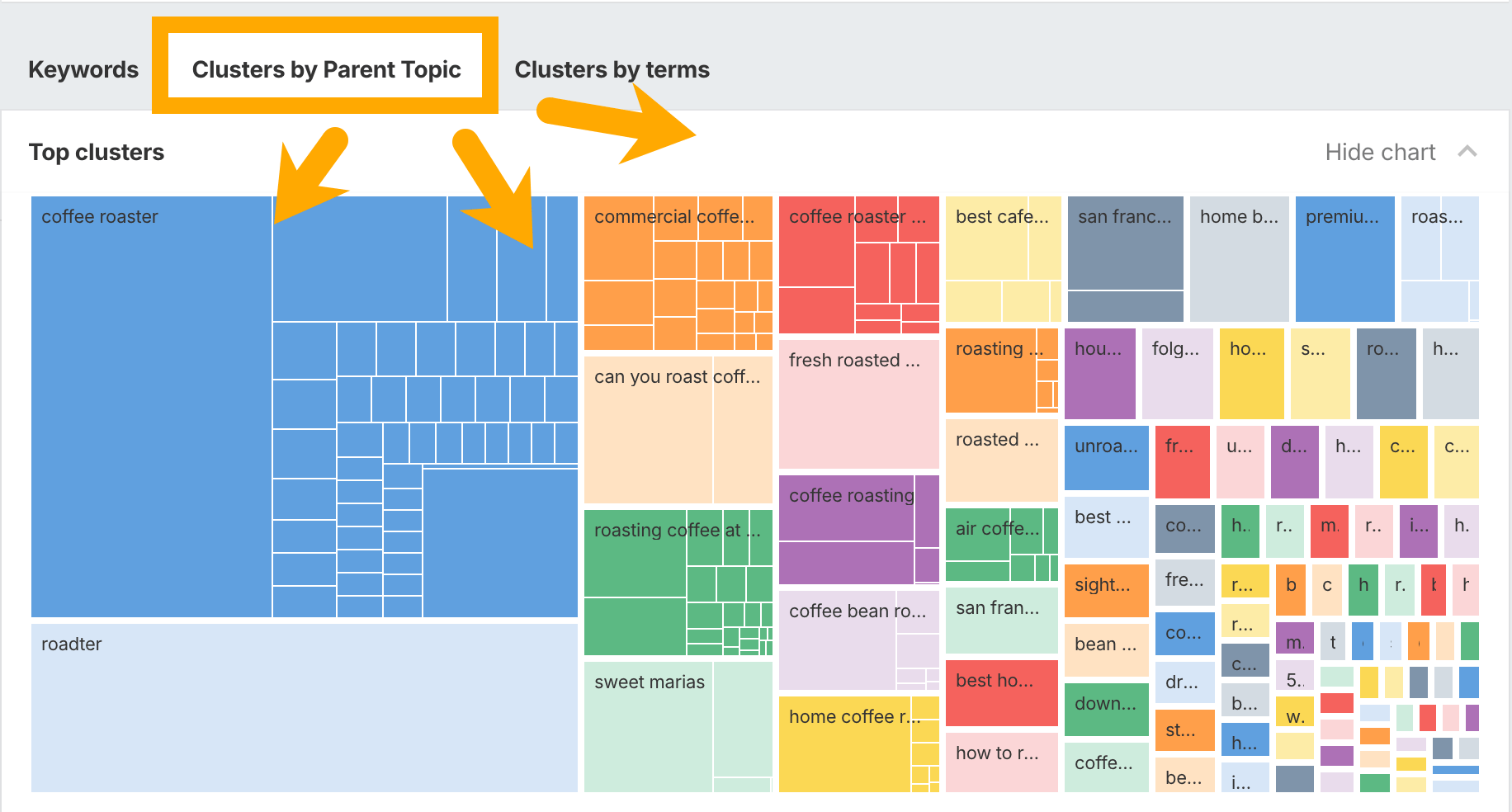 In Keywords Explorer, switch to the Clusters by Parent Topic tab. This groups keywords by their parent topic—a proxy for search intent.