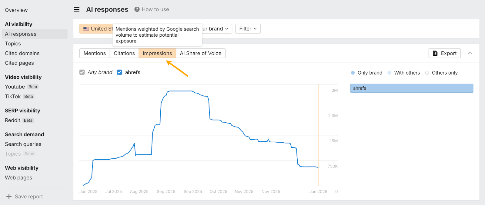 In Ahrefs, you’ll also find an additional metric called mention impressions. This estimates how often those mentions reach users by factoring in Google search volume for each prompt. That way, you’ll know which mentions matter most, and how loss/gain of mentions impacts your reach.