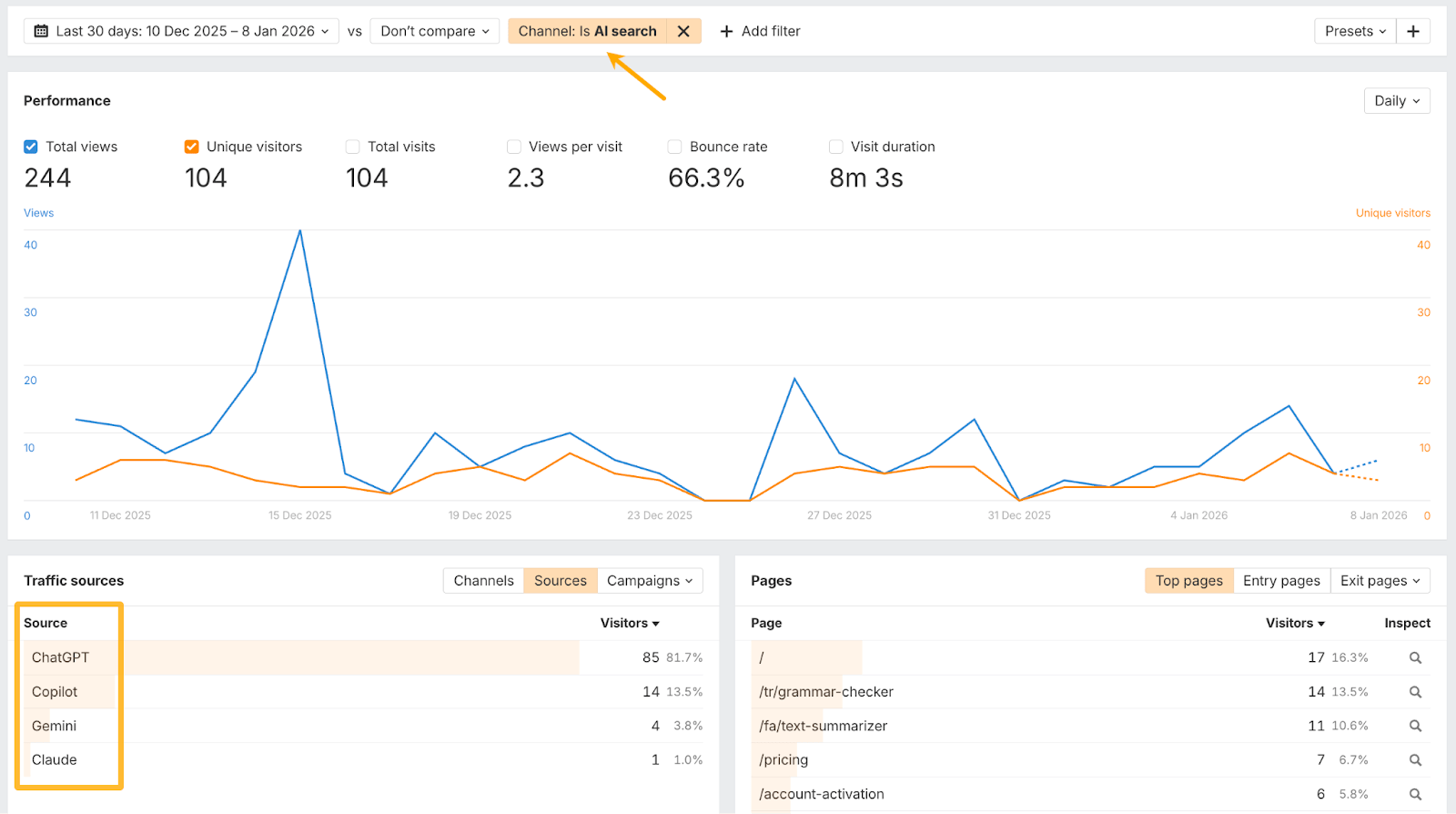For tracking actual traffic from AI platforms, try Ahrefs’ Web Analytics for free here. It shows referral traffic from ChatGPT, Perplexity, and other AI sources in your traffic reports.
