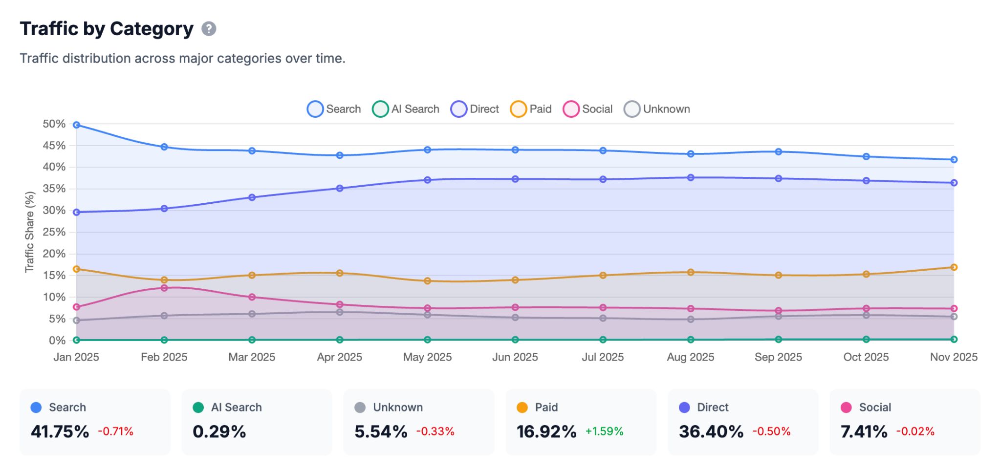 Google Search can still drive huge amounts of relevant, qualified traffic to your website. In fact, when we analyzed the traffic distribution of 71,000 websites, Google Search was the #1 traffic source, accounting for almost 42% of all website traffic (compared to just 0.29% for all AI assistants combined).
