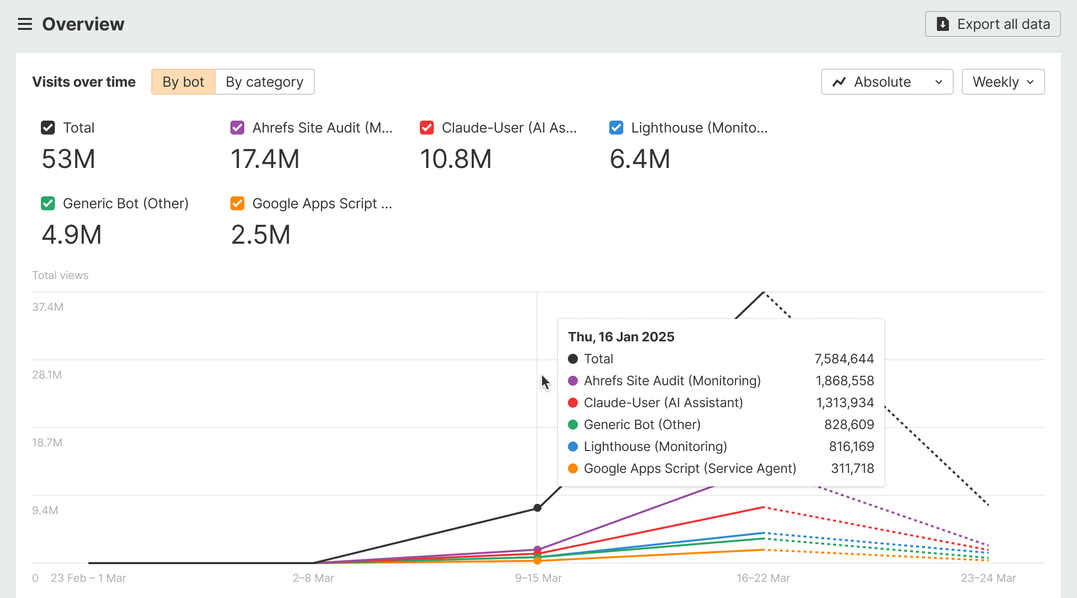 Tracks search engines, AI crawlers, SEO tools, social bots, and more.