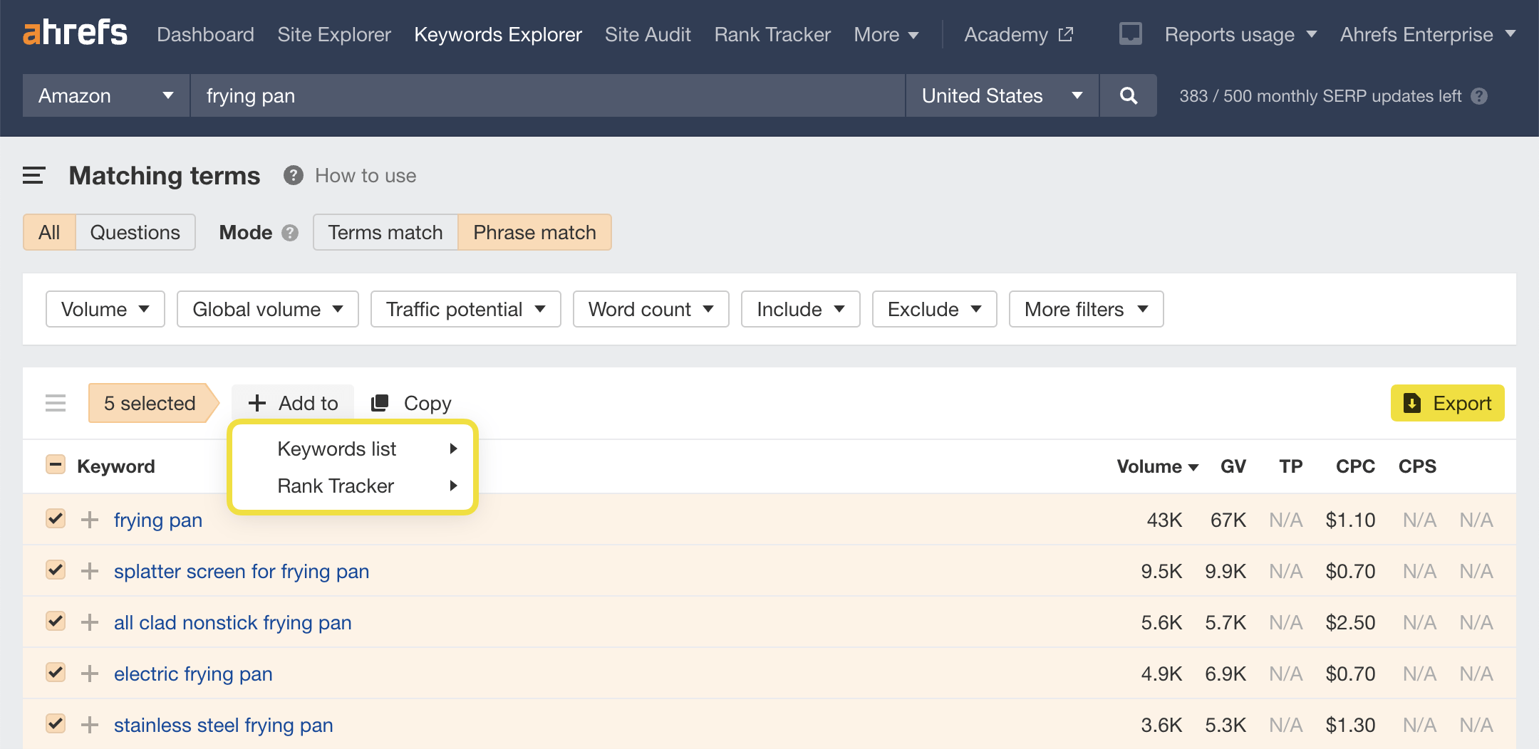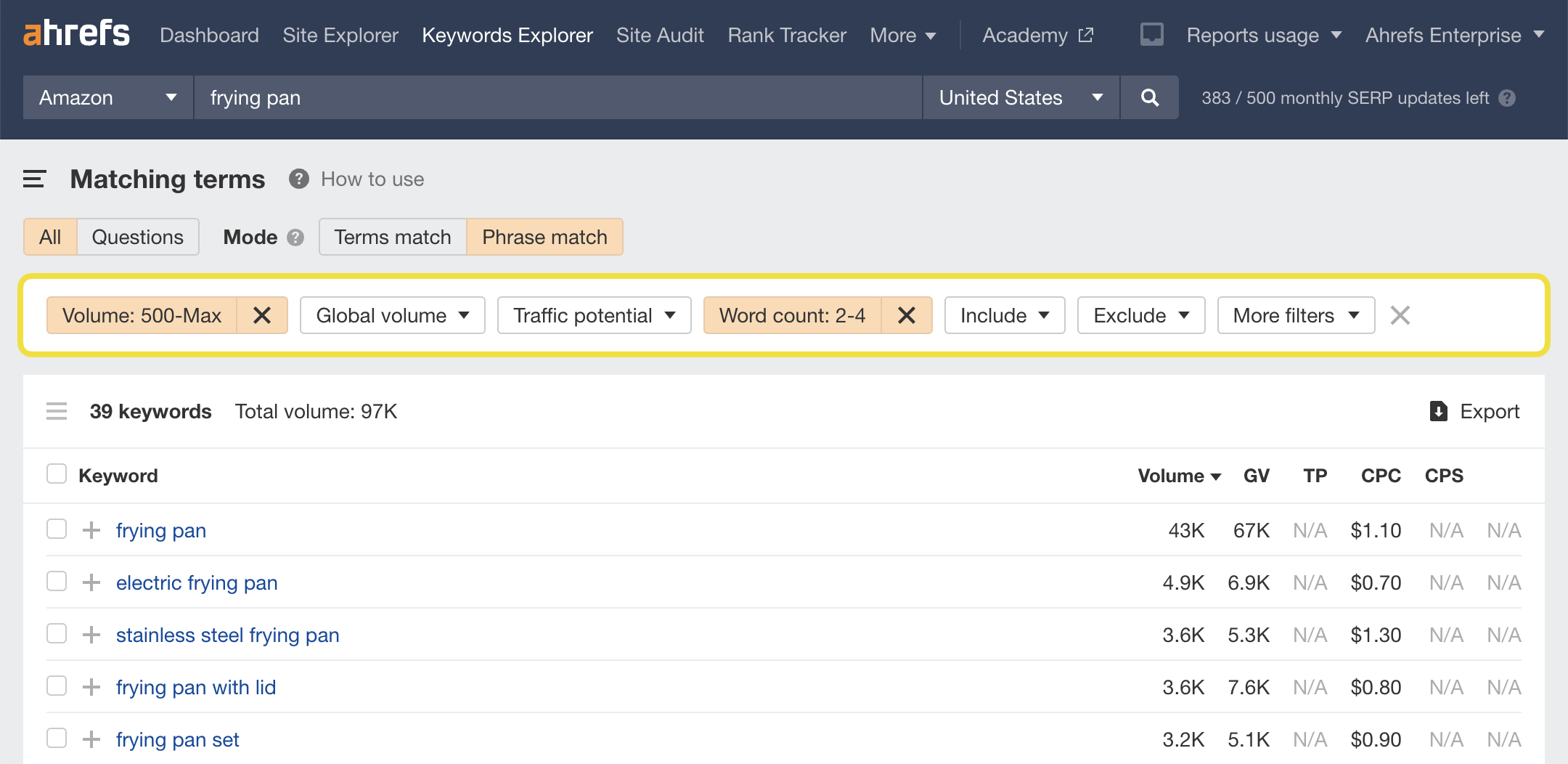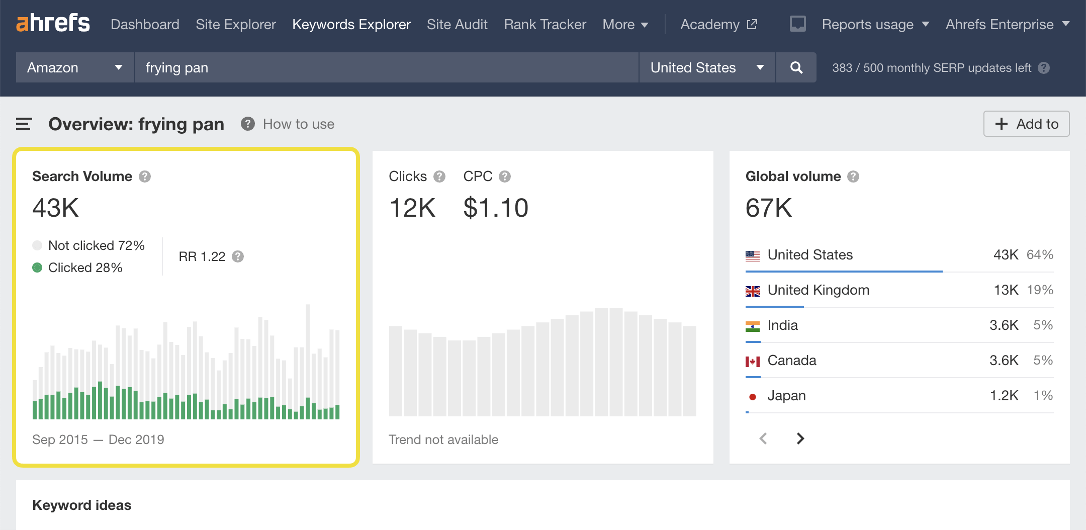 Enter a broad description of your product into Ahrefs’ Amazon Keyword Tool and check one of the five keyword ideas reports to see the most popular related search terms.