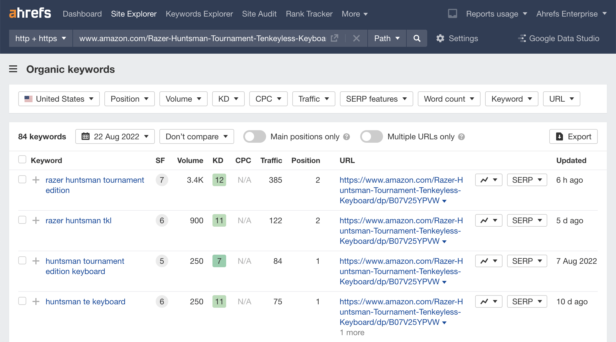 Paste any competing Amazon listing into Ahrefs Site Explorer and head to the "Organic keywords" report to see the keywords it ranks for in Google.