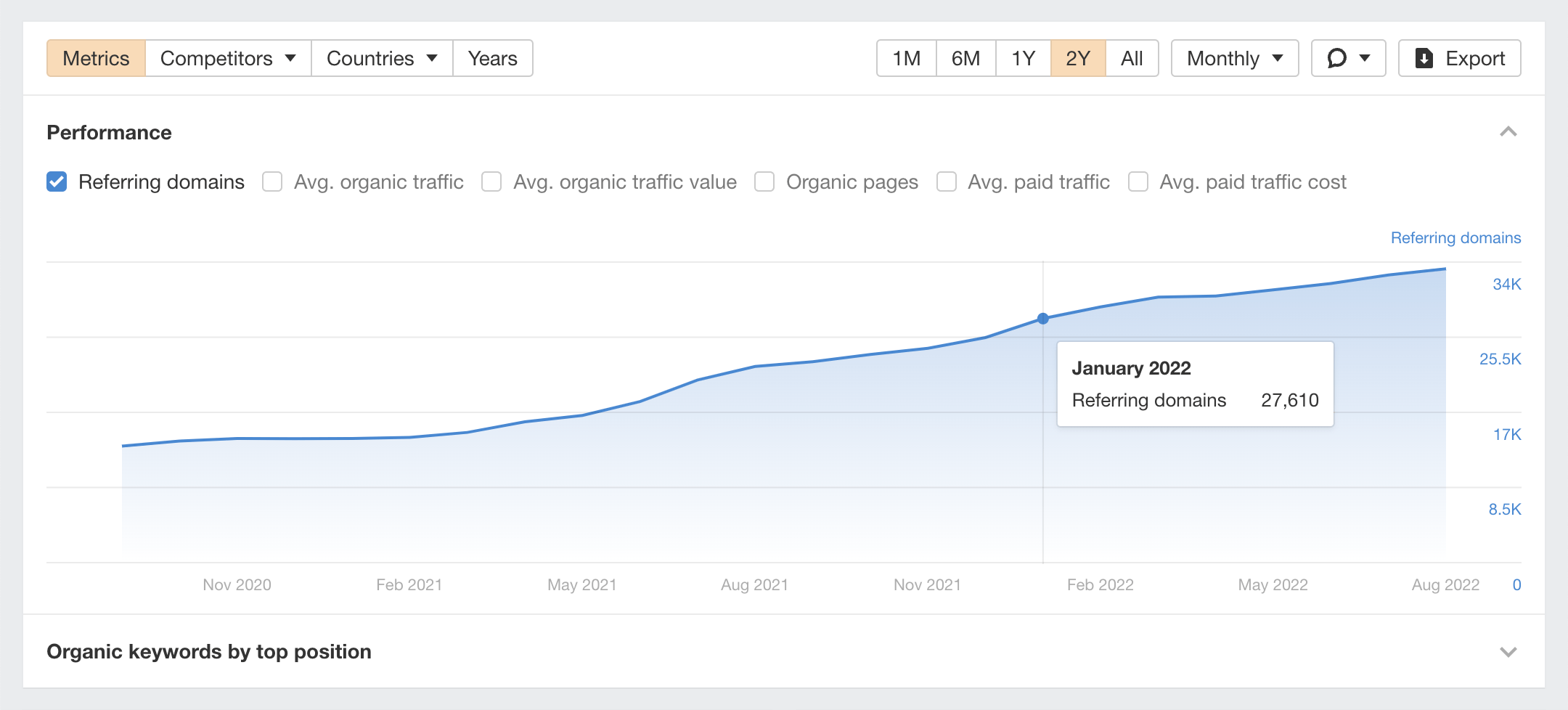 Check the Referring domains report to see every linking domain, along with useful SEO metrics.