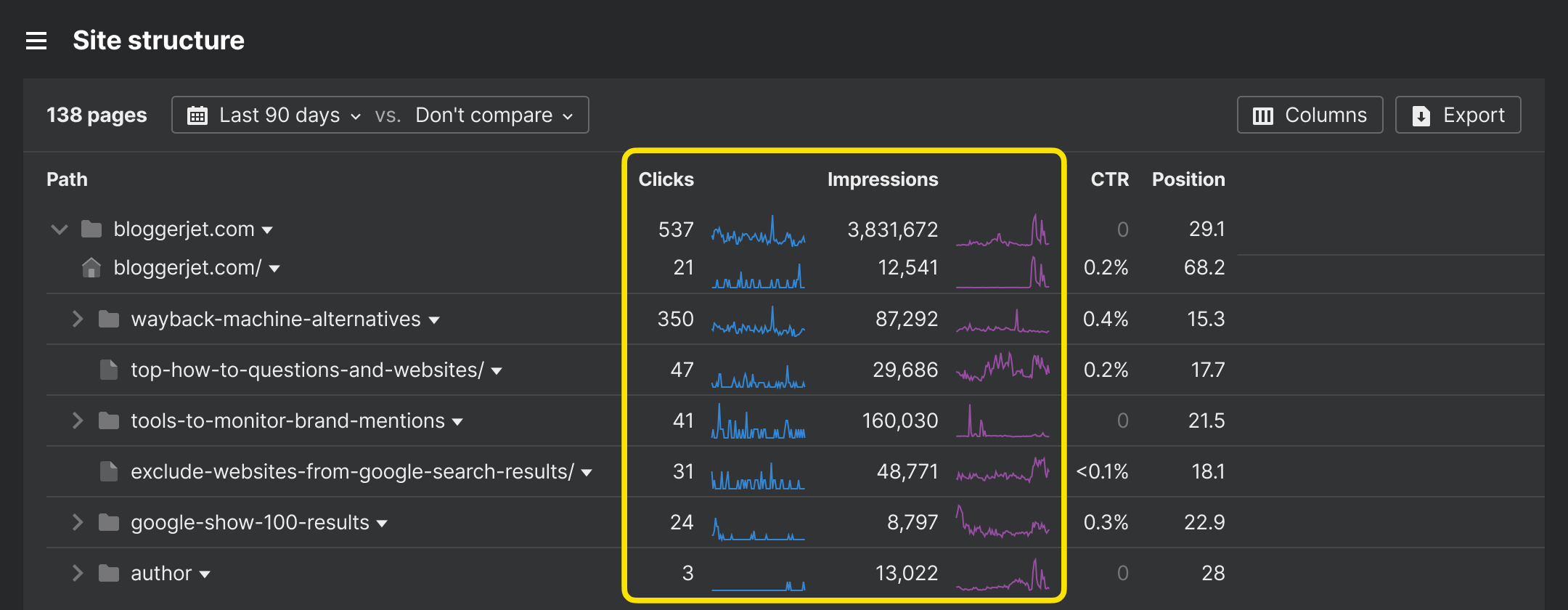 Your keywords and pages get paired with Ahrefs metrics and insights.