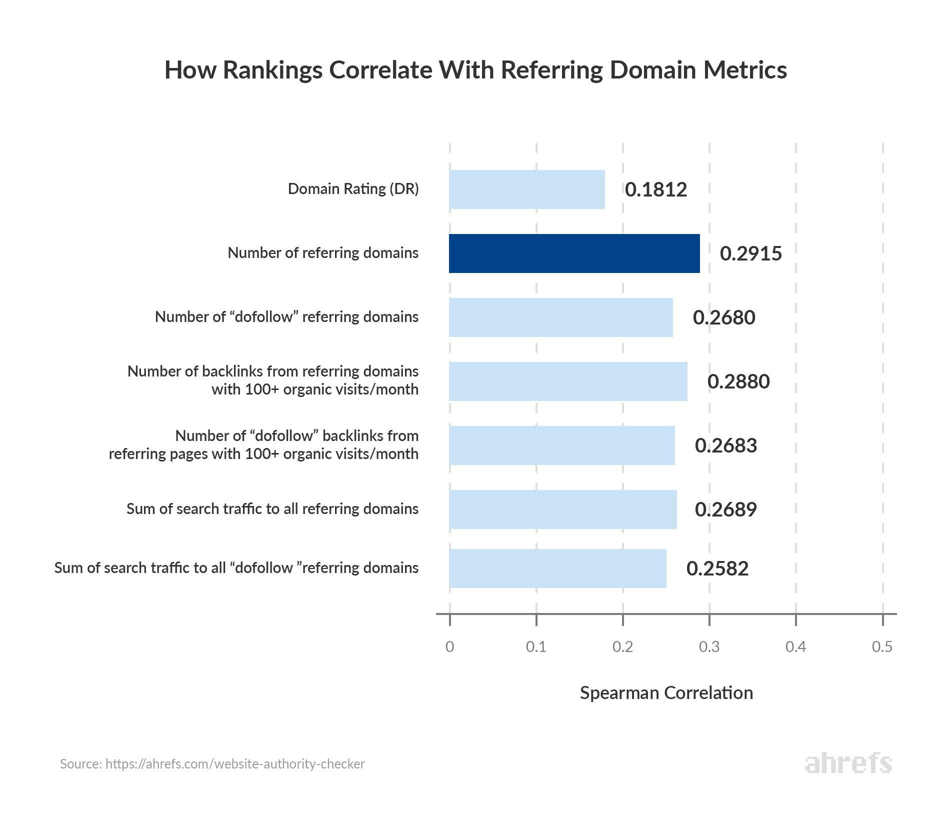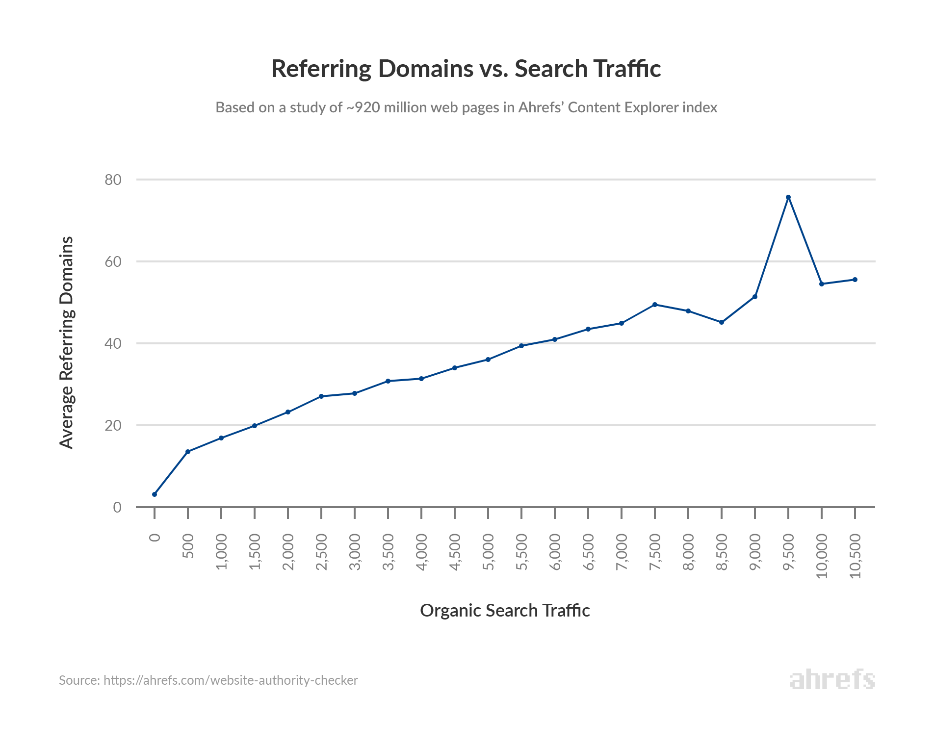 その代わりに、業界で評判の高いサイトの強力なページから、Google で上位表示させたいページへのバックリンクを獲得することに集中すべきです。なぜなら、ページへの参照ドメイン数とオーガニックトラフィックの量には明確な相関関係があるからです。