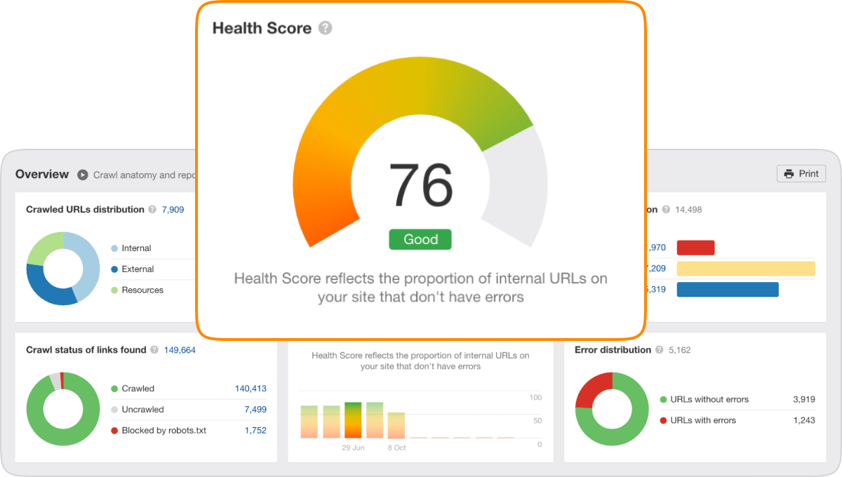 Check your website’s overall SEO performance at a glance with Health Score, a two-digit number based on the number of errors found.