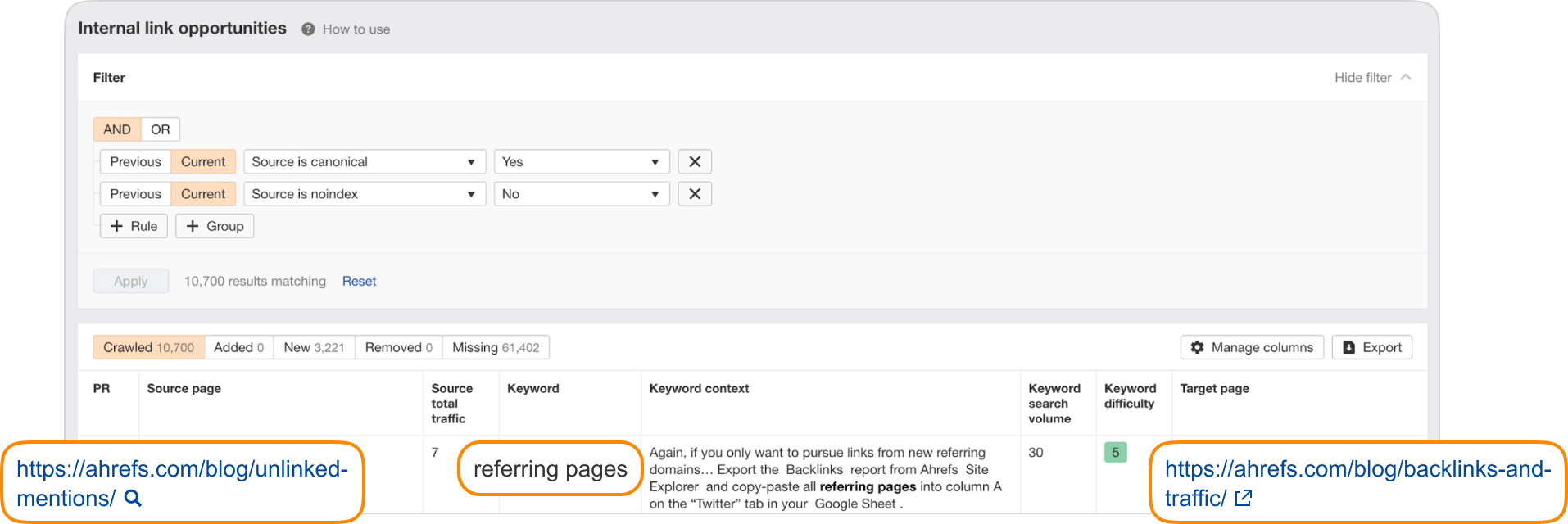 Internal links are a powerful way to move the needle on your rankings. Our Link Opportunities report helps you find places to add relevant internal links to other pages on your website.