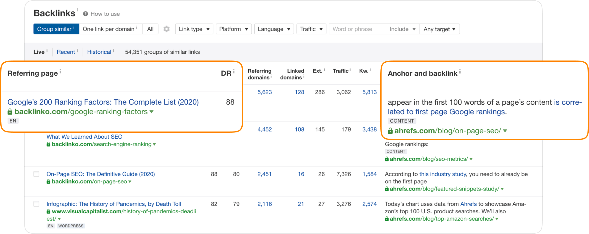Learn who's linking to you, and why. Get insights about the strength of each linking website and page with SEO metrics like Domain Rating (DR), URL Rating (UR), and estimated organic traffic.
