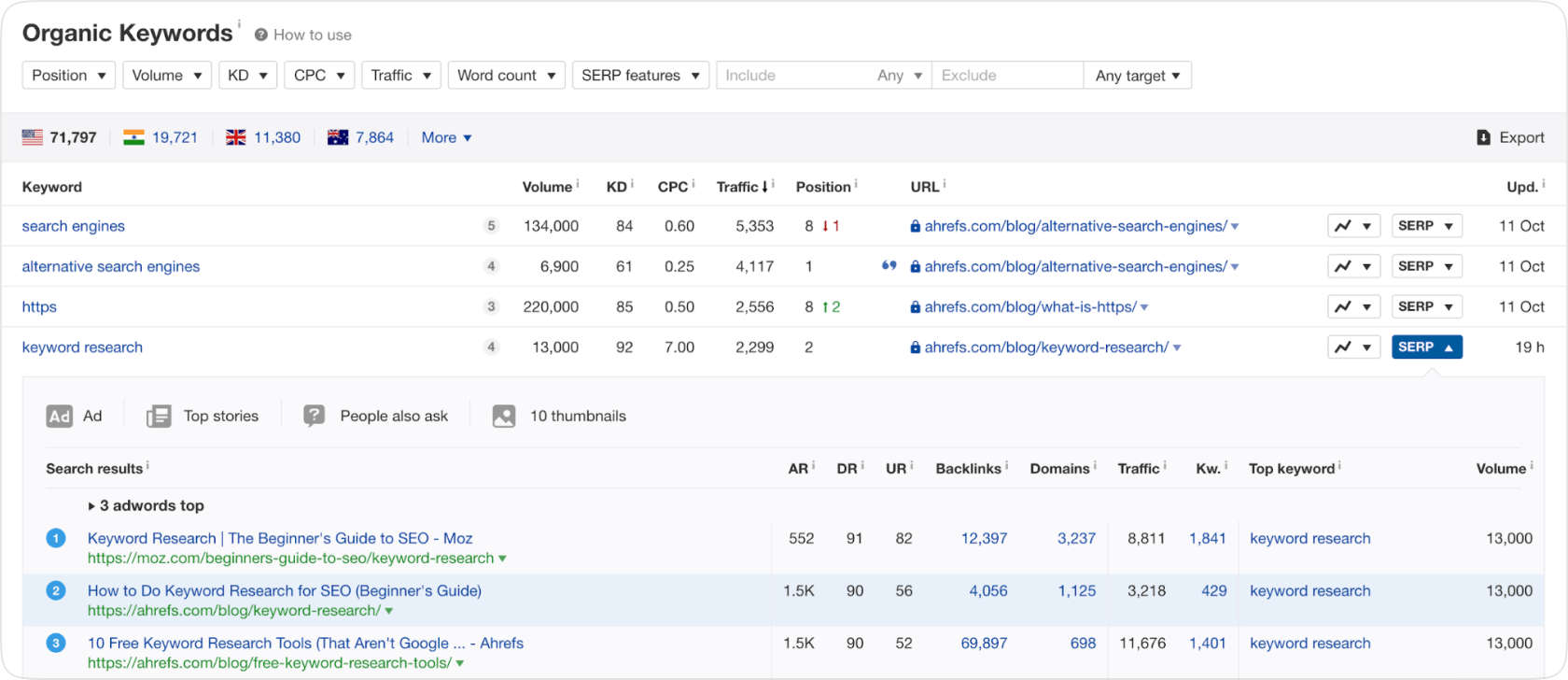 See every keyword you rank for in the top 100, where you rank, and how much traffic each term brings you. Compare how you stack up against competitors at a glance.