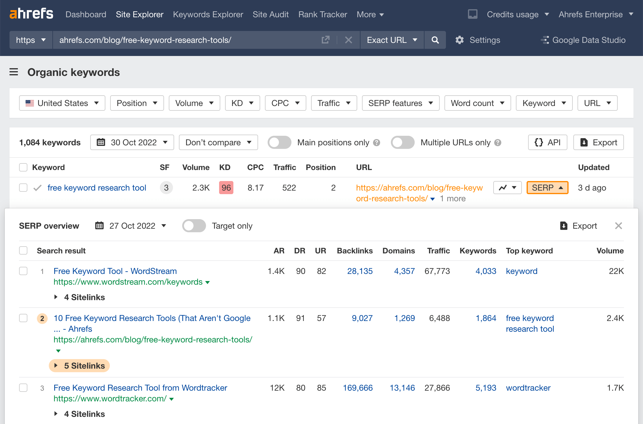 Ahrefs’ SERP Checker gives you an accurate ranking difficulty score and detailed SEO stats for the top 10 search results. This lets you see the whole picture and make informed decisions.