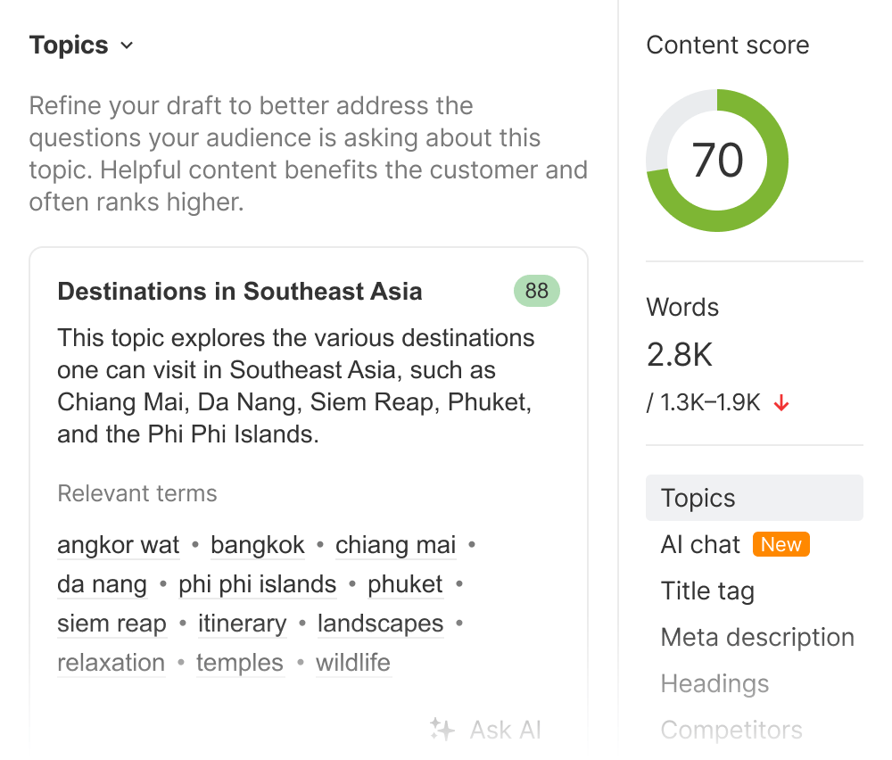 AI Content Helper optimizes your writing with topical scores, SERP insights, and AI chat to uncover topical gaps fast.