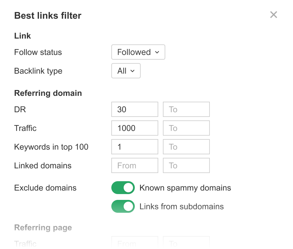 Ahrefs’ Best Links filter lets you configure the type of links you see across all reports and charts.