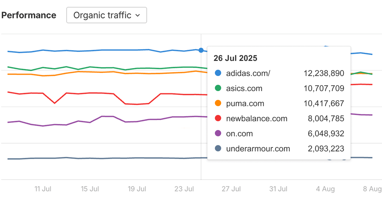 Use the Performance chart to scan up to 10 competitors across Organic Traffic, Referring Domains, Share of Voice (SOV), and more metrics.